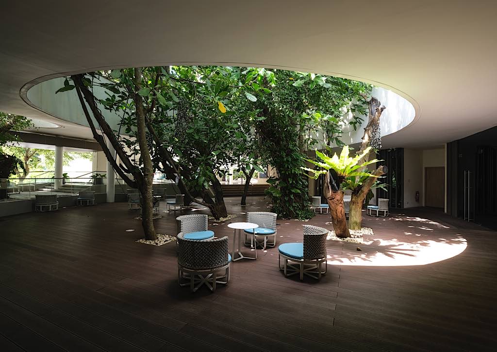 The Health and Leisure wing comes up from a ramp, which is made of wood and turf. One may do physical exercise there, for visitors who regularly work out. Right in front of the lobby is the beach, where pools and bridges are incorporated. The pool is reminiscent of the sea, which has a slope that is made for small children to wade in.