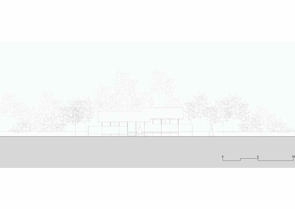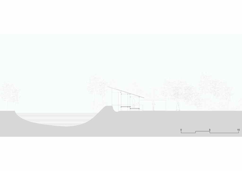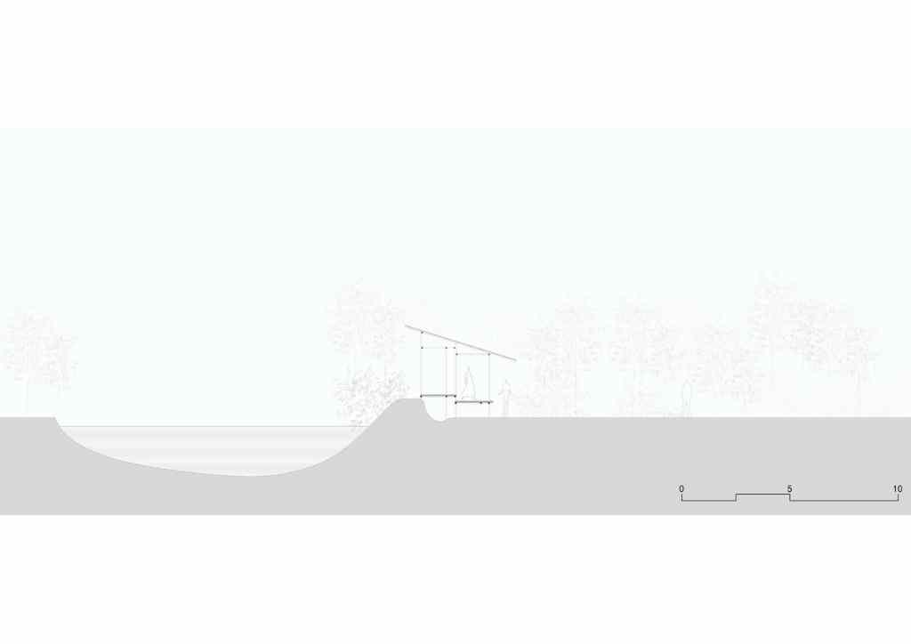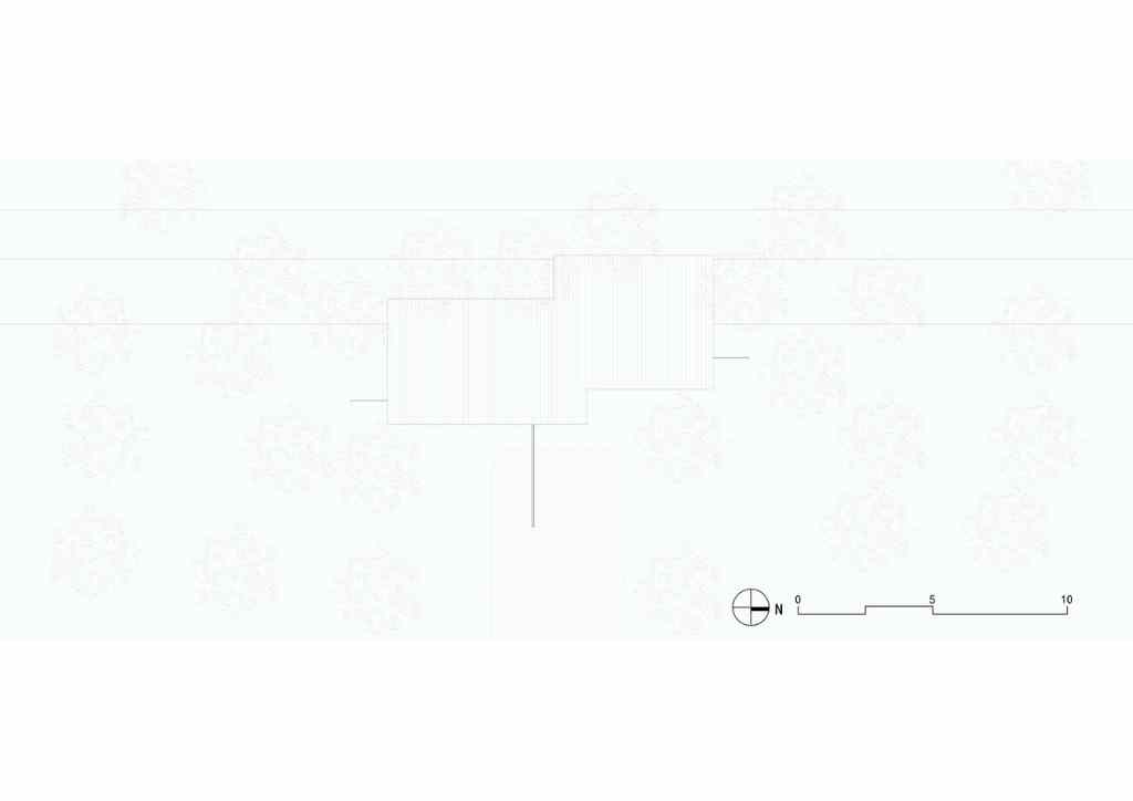 So far, the three platforms are staggered and combined with the spacing of the bamboo forest. The tree platforms are lowered downward by getting close to the terrain and elevated from the concave groove. The surface of the house is at the downward trend along with the single slope, combining the terrain and the bamboo grove.