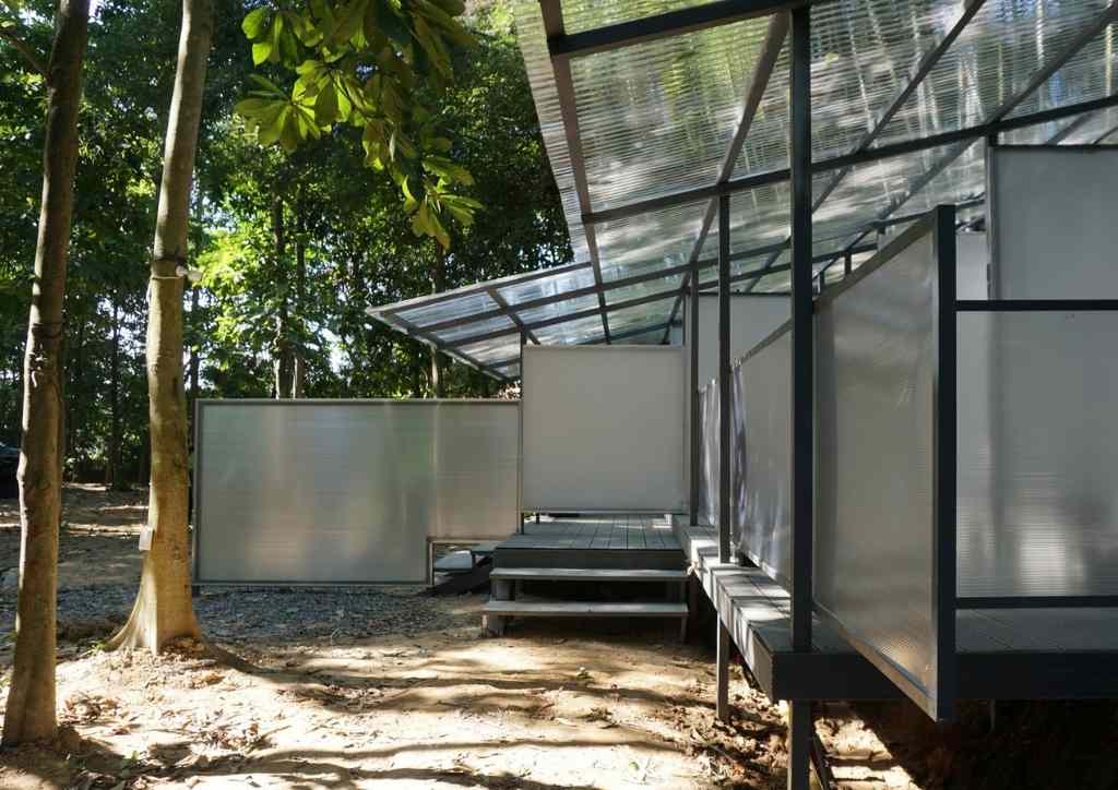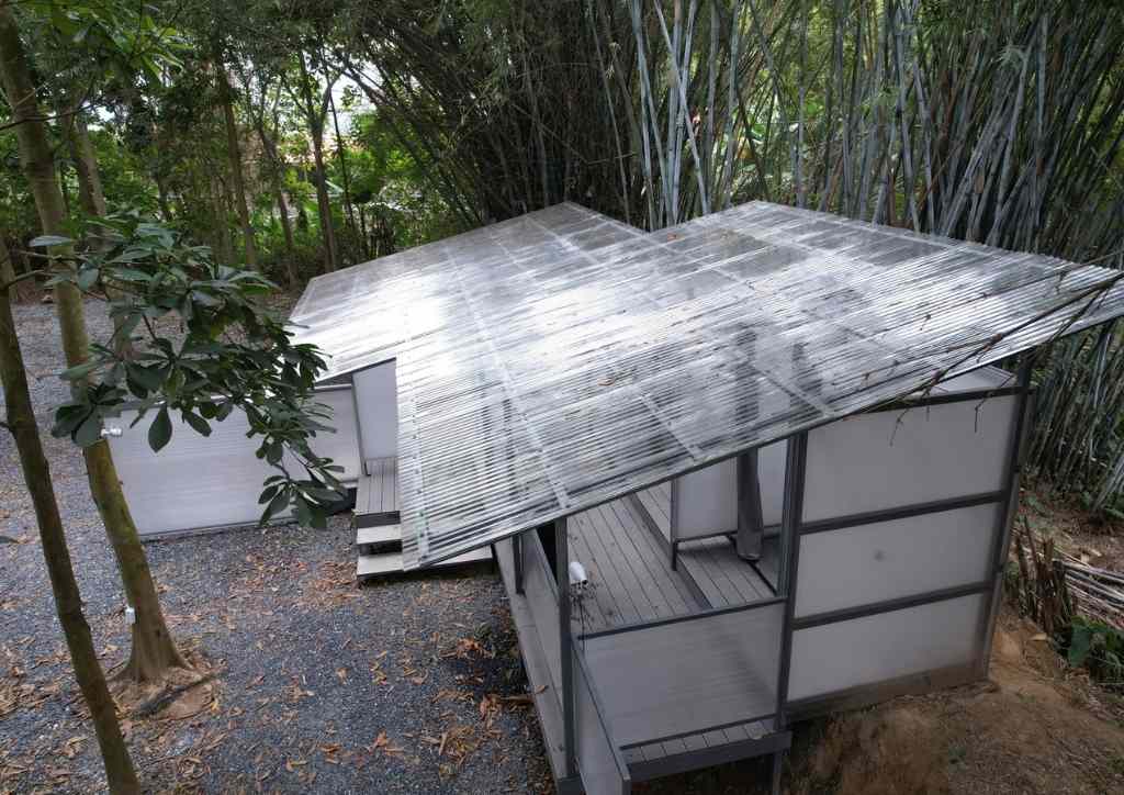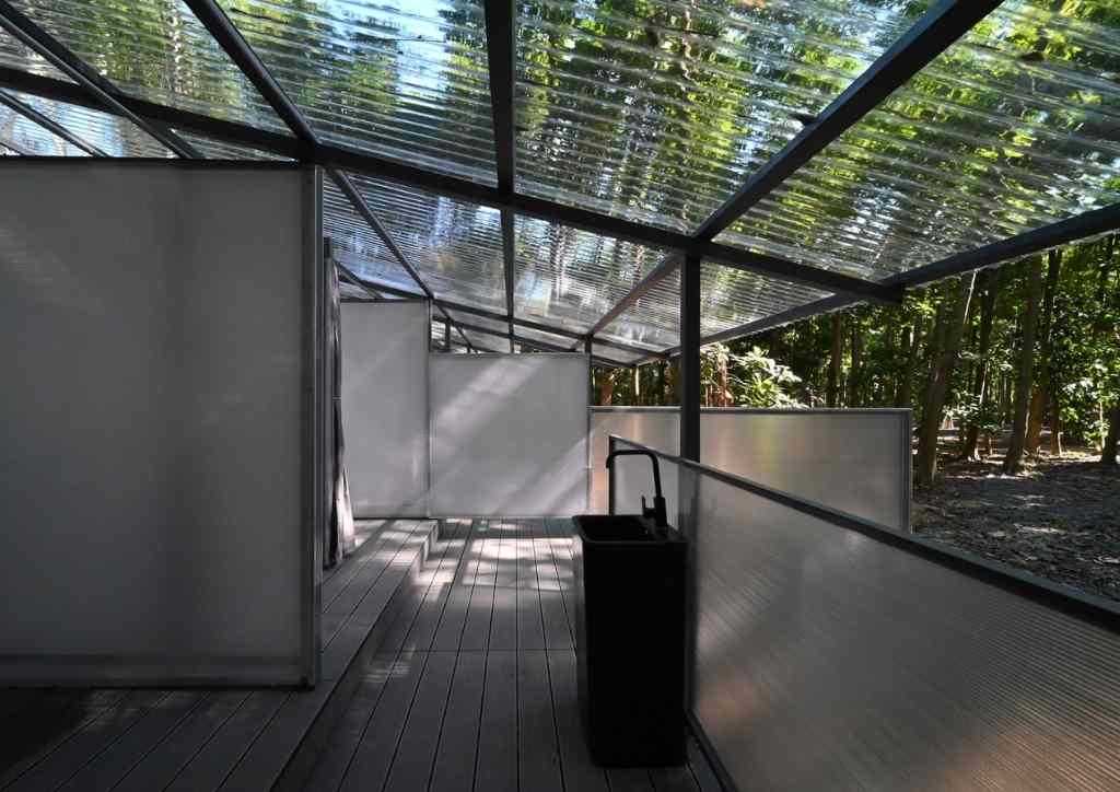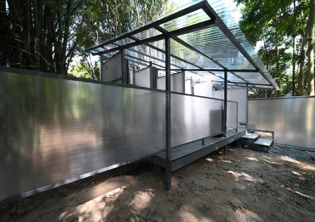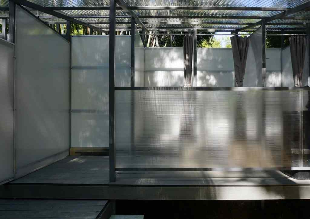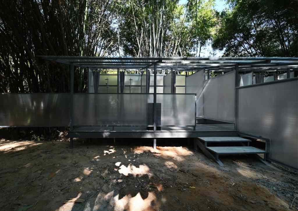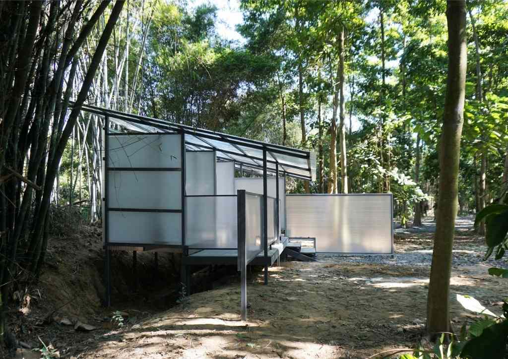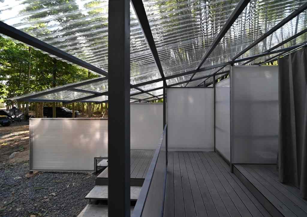 The wall body of the architecture is equipped with an abrasive polycarbonate panel, and the surface has a transparent corrugated plate. With a height of 2 meters, the wall body is treated separately from the roof, thereby guaranteeing ventilation while offering the high-window perspective of appreciating the bamboo view.