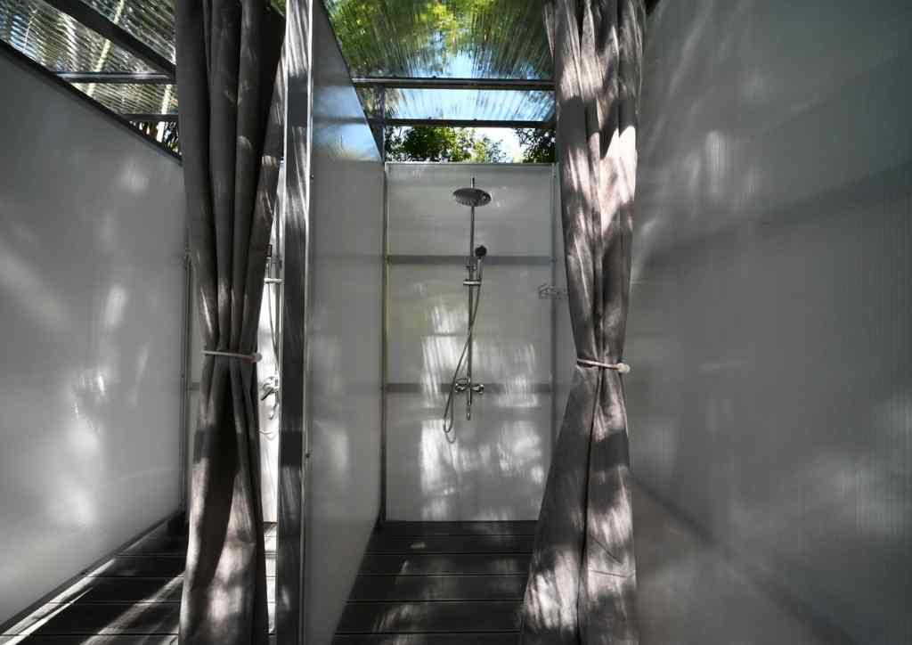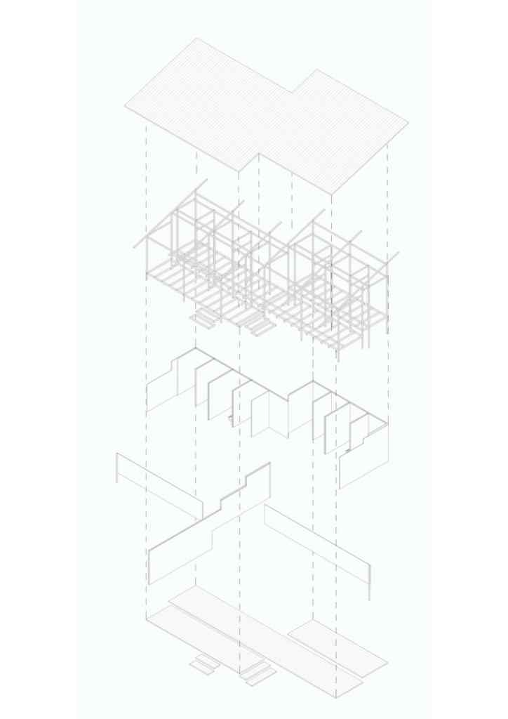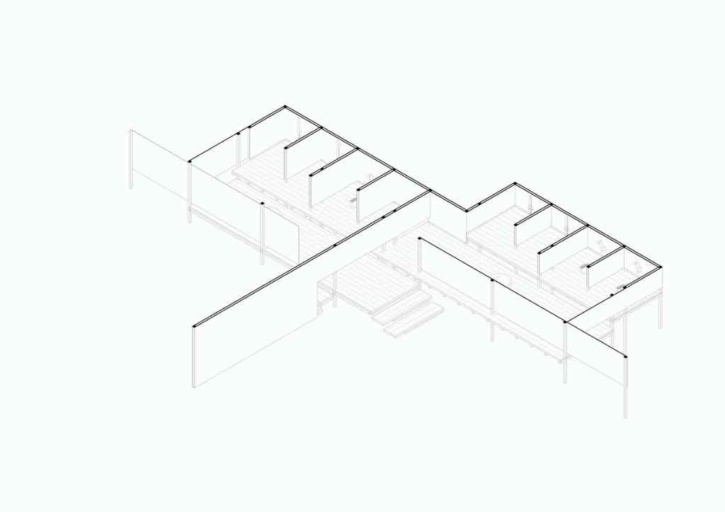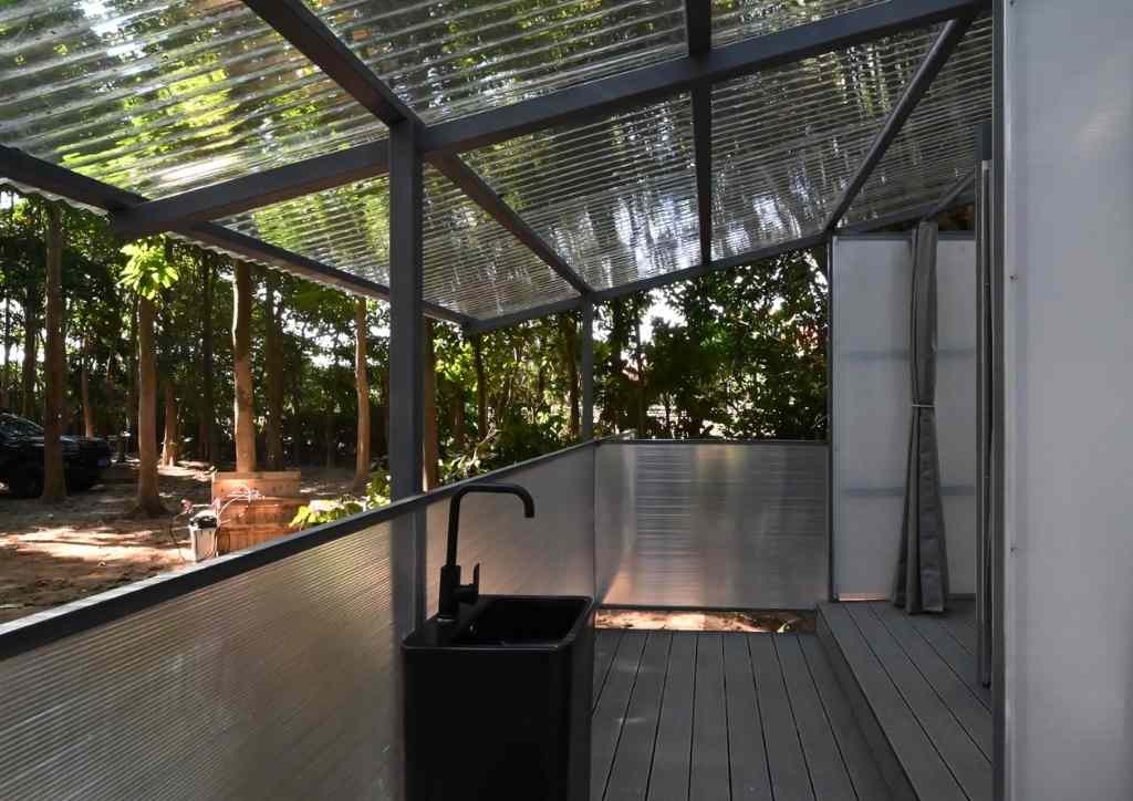 The form of a single slope is selected when designing the roof, the three platforms are leveled, and the eave in front of the two passages is pressed down by controlling the net height of 2 meters between the pathway. It is under the sloped roof and the bathroom, in order to provide privacy upon fully opening the elevation.
