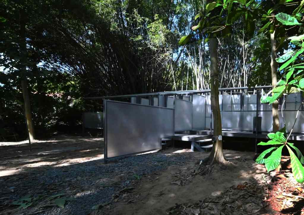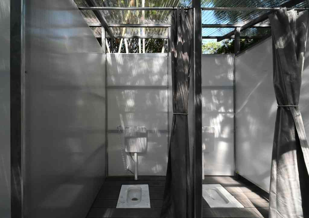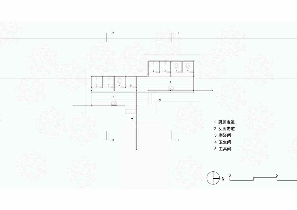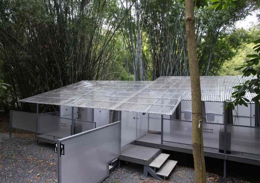 The female bathroom has a plane area of 4.8 x 1.2 meters, placed between the two groves of bamboo on the soil slope. The elevation is marked at 1.2 meters. Meanwhile, the plane unit of the male bathroom platform staggers with it, simultaneously lowering the height of one step. In addition, the platform of the male bathroom is extended to the right for the purpose of forming a passage leading to the female bathroom. By analogy, the front side of the male bathroom will be lowered to one platform, forming the passage into it.