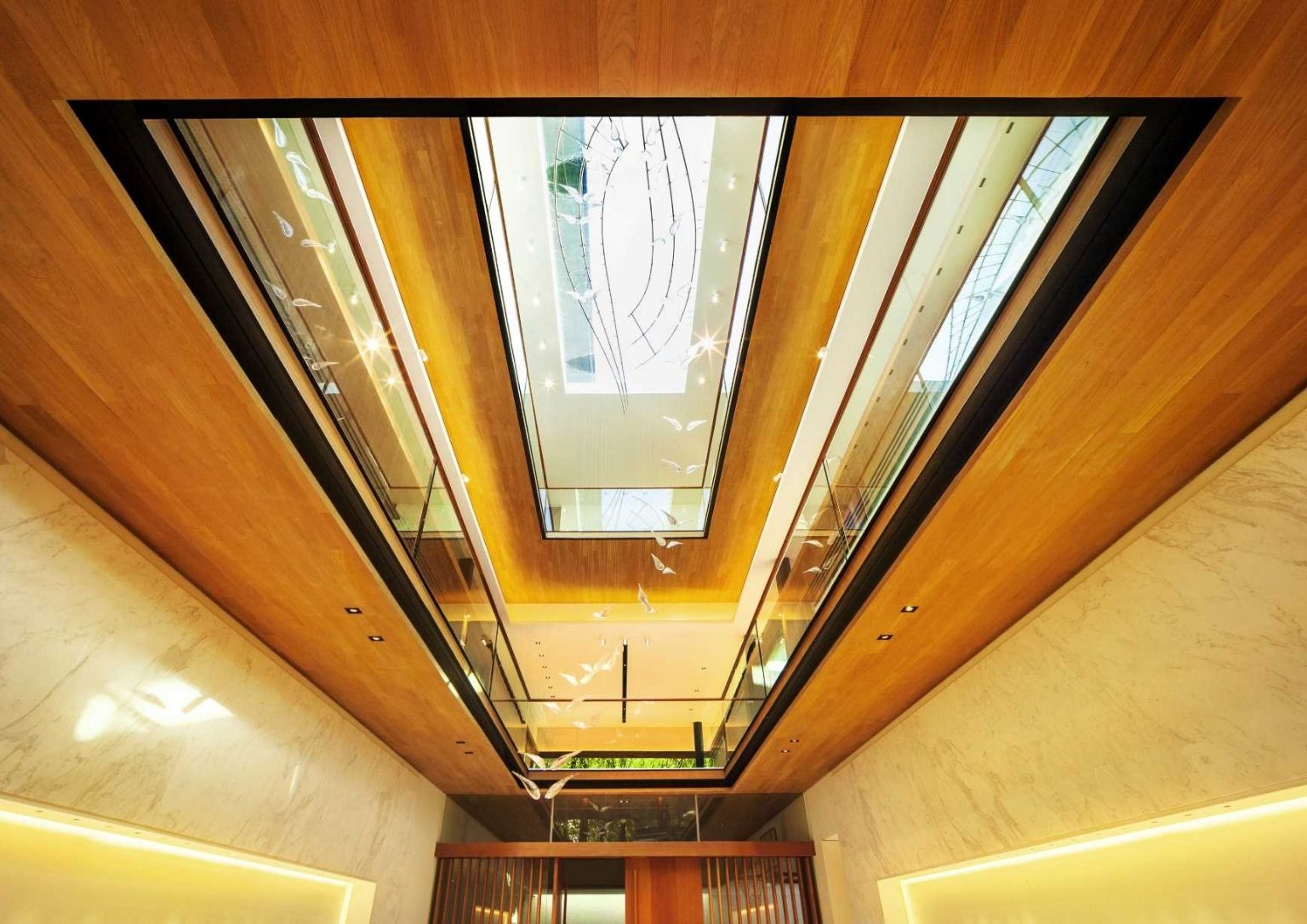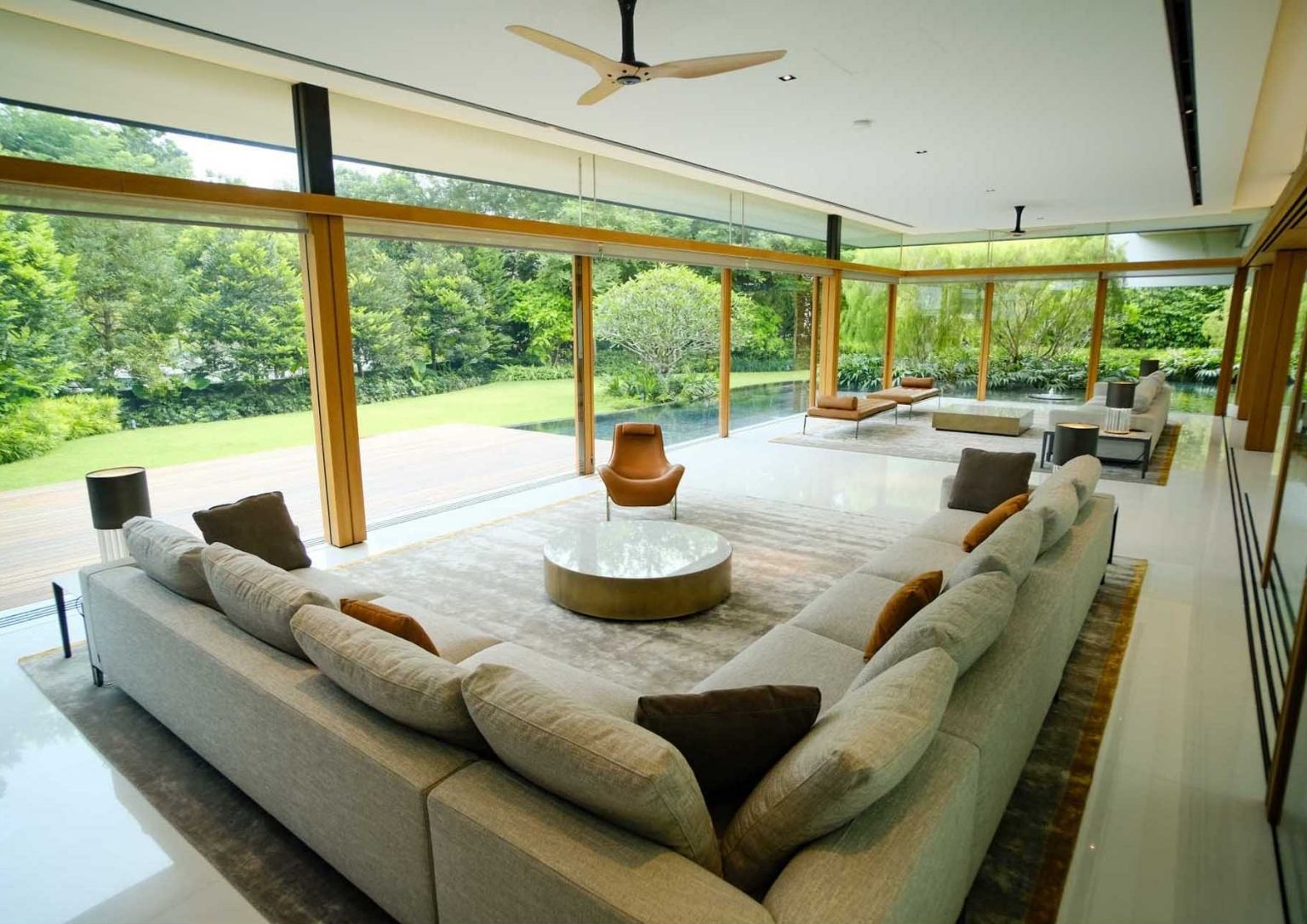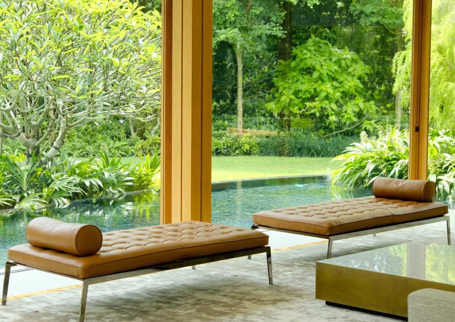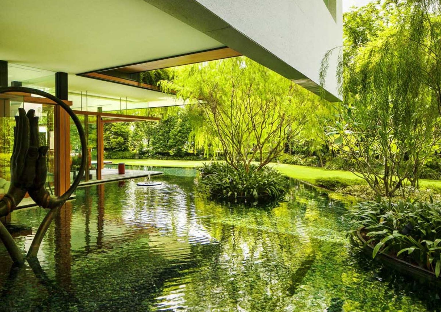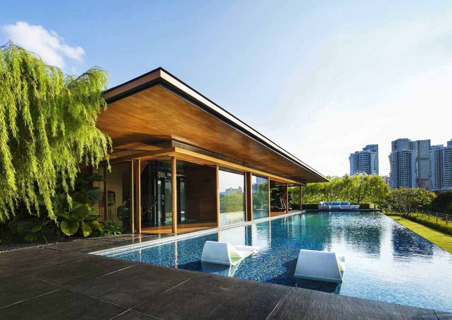 A water feature on the ground level encloses the living areas. Moreover, the other social sections of the Sky Pool House have access to the water aspect as well as the deck and the yard. The floor-to-ceiling windows add to the cozy vibe as it allows natural light to envelop the internal parts of the home.