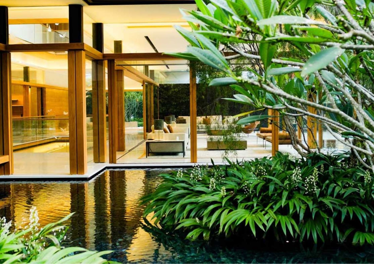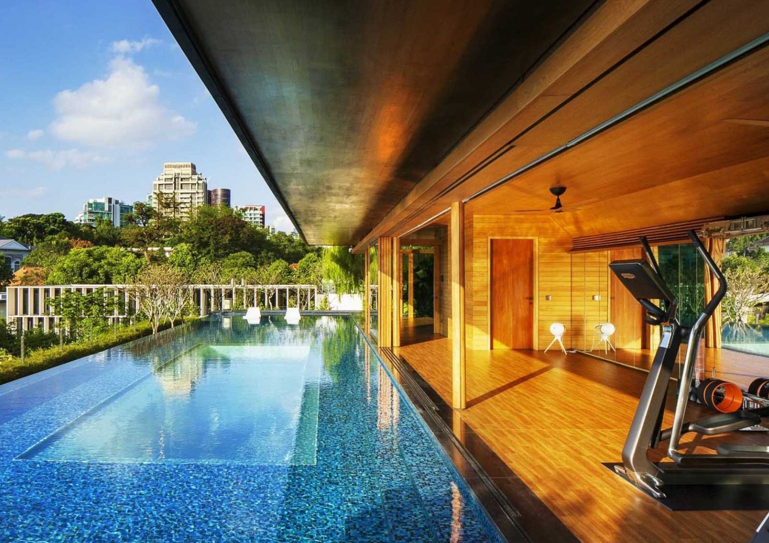 Predominantly adapting biophilic design, the roof deck area offers a strong connection to people with the natural environment. An overhanging roofed gym in teak cladding help shade the seamless walls and swimming pool that overlooks the city. The rooftop garden goes around the perimeter of the top floor creating a more private ambiance.