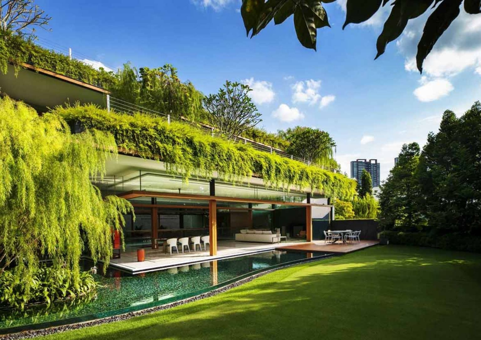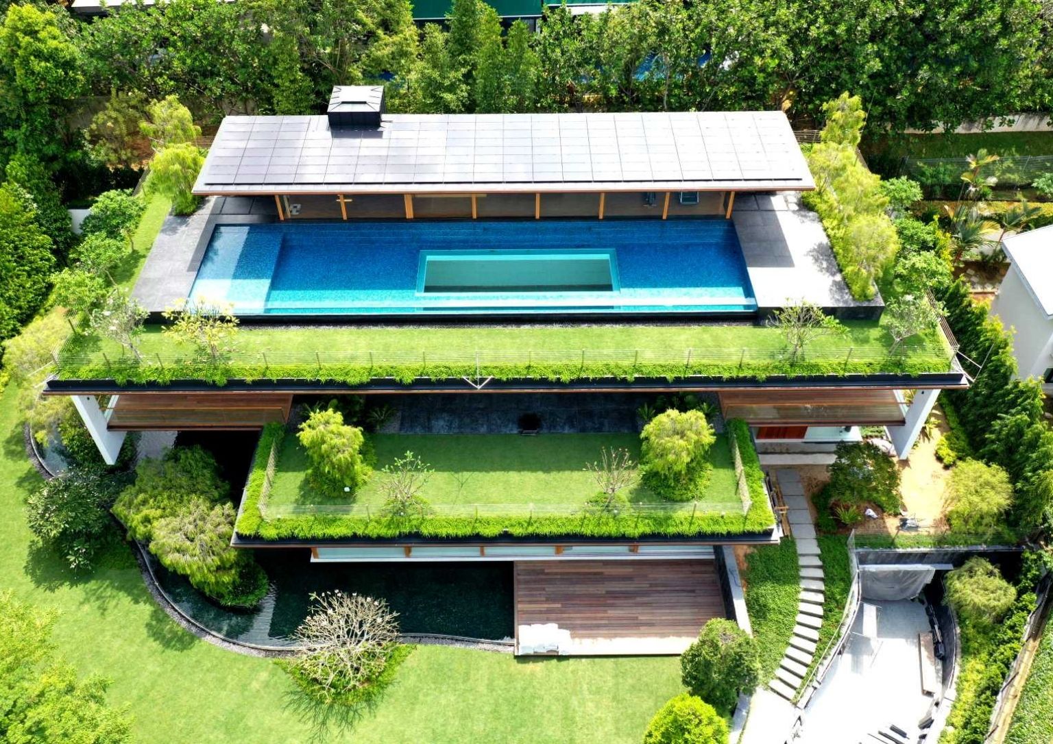 The Sky Pool House by Guz Architects in Singapore centers on verdant greenery. The Singapore-based studio completes the modern house in 2020. The most dominant element, the gardens, surround the entire property. Aptly called the terraced roof gardens, it gears toward keeping the home cool. Each level is provided with its own. The plants become part of the design as it flows over the edges of the roofs which then gives the house a warm facade.