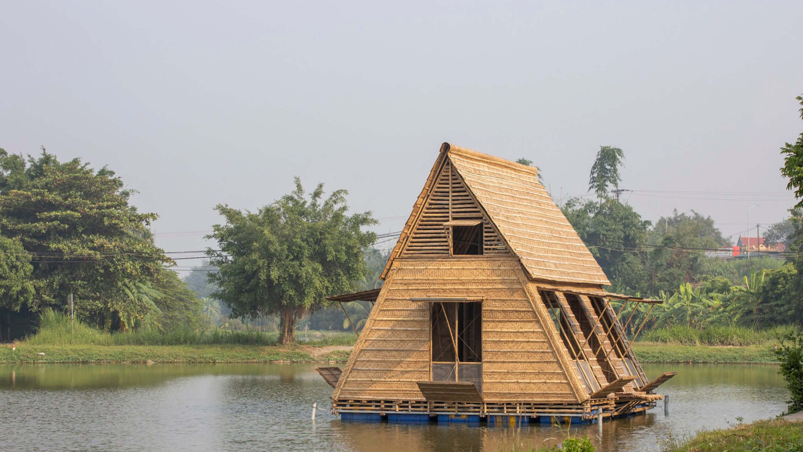 Inside and outside, the Floating Bamboo House is covered in light materials like compressed weaved bamboo sheets, leaves, corrugated iron, and bamboo screens among other materials. Above, the house is equipped with a large roof that collects rainwater and harnesses solar energy. With a door system that flexibly opens and closes, the house is sturdy enough to endure adverse unfavorable weather just like how lotus flowers can easily float even in surging water.