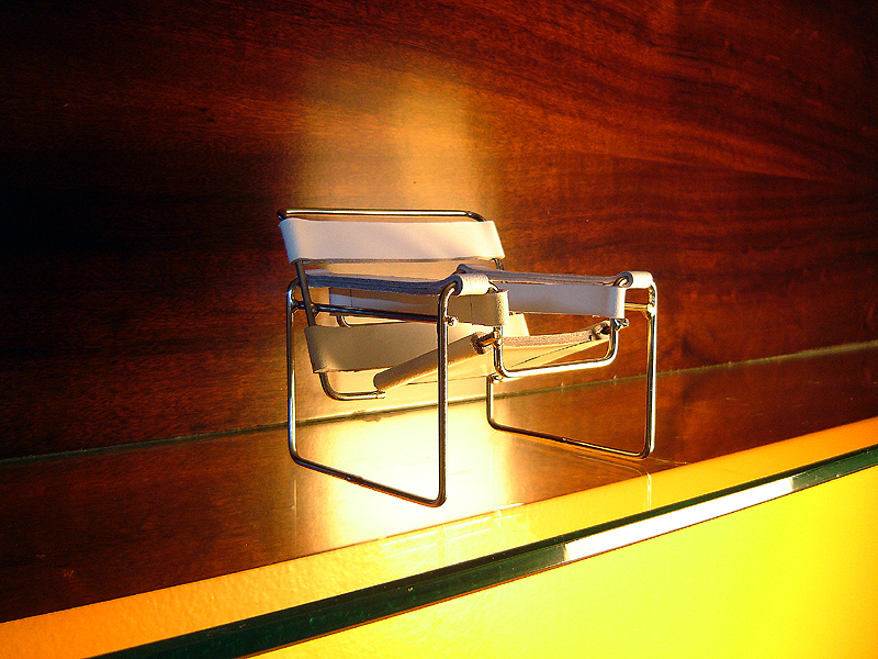 Designs such as Marcel Breuer’s Wassily Chair illustrates this with its sleek tubular steel frame that holds up the minimal leather upholstery. The exposure and raw use of these materials can be described as honest and elegant in their composition. Another example of this would be the Brno Chair by Mies van der Rohe, a modernist architect who favors a flatter but wider chrome frame with a thick leather seat. Lastly, the Baby Cradle by Peter Keler showcases a complete array of Bauhaus elements with its primary colors and form factor.