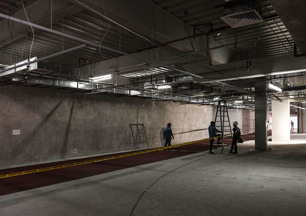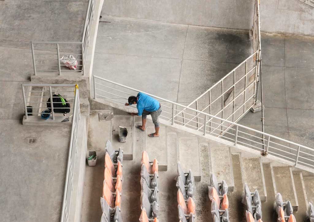 From the heavy rainclouds in the sky, we lowered our gaze a bit and saw the newly installed floodlights ringing the stadium roof.  Two scoreboards that weren’t there before hung on each short end of the stadium. Also newly set in inside the oval were two sets of netted posts for throwing events like the shot put, discus, hammer, and javelin. White lines and numbers now marked the competition track lanes, along with yellow and blue markers for hurdles. The interior spaces of the stadium are the stark opposite of what we see outside. While the competition area is soaked in rain, the rooms underneath the bleachers are dry and dusty. Although the workers had begun vacuuming and washing the floors and walls, we were allowed to take peeks at the finished bathrooms, locker rooms, shower rooms, lounges for the VIPs and judges, and the indoor warm-up track underneath the bleachers. The air-conditioning units were already installed, although some hitches occurred in the lobby, with one of the subcontractors failing to make provision for more discreet placement of the ducting.On the west side of the Athletic Stadium, across the soil-cemented earth that serves as a temporary road, is the warm-up track for the athletes, which may later be used by the public. “We’ve finished sealing the final layer for the warm-up track, which is the rubber sealant. Now we’re putting the last two layers of rubber. So, once the rain stops, we don’t have to dry it anymore, we just have to remove the water and put the final layer in,” David explains.