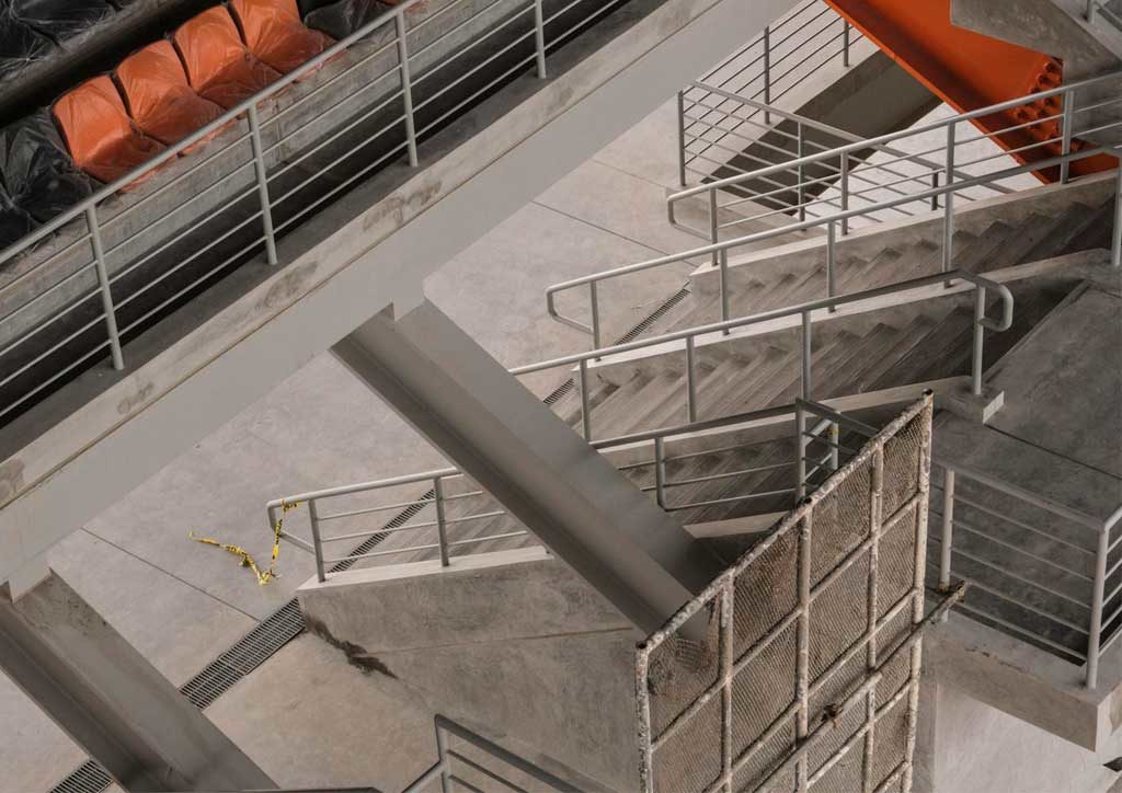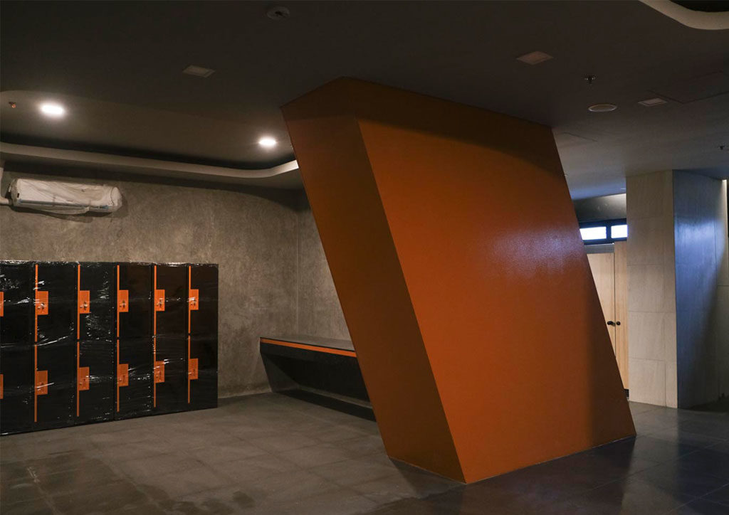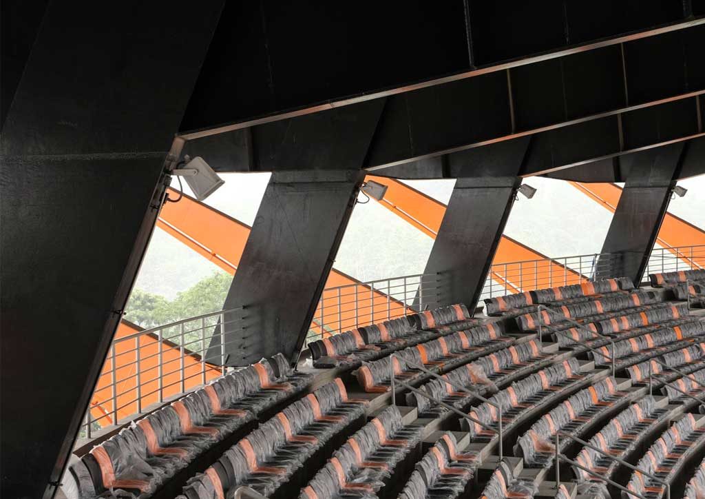 Misty scenes greeted BluPrint when we arrived at 7:30 a.m. The bright pillars of the stadium in the patented ‘B+R Active Orange’ by Norwegian paint manufacturer Jotun and the pixelated flames formed by the bleacher seats appeared to us like a watercolor vignette. Unlike our first visit in May, when we squinted at the arid and dust-blown the stadium from behind tinted sunglasses, this time our eyes drank in the lush green of grass filling the center of the track oval, albeit behind thick and thin curtains of rain.