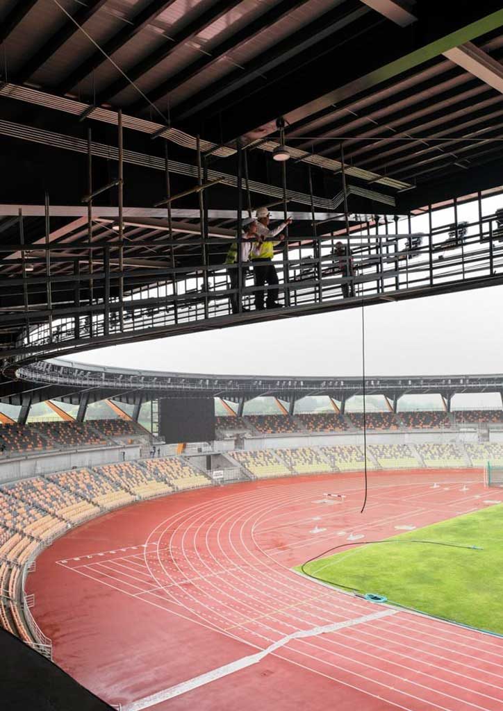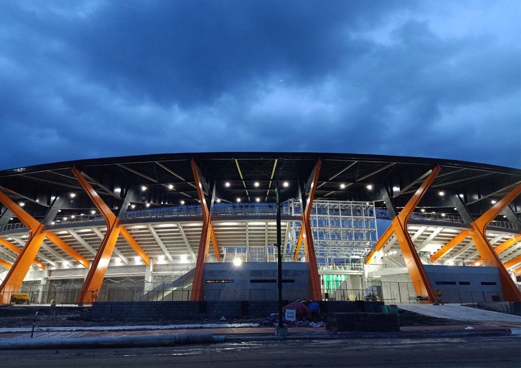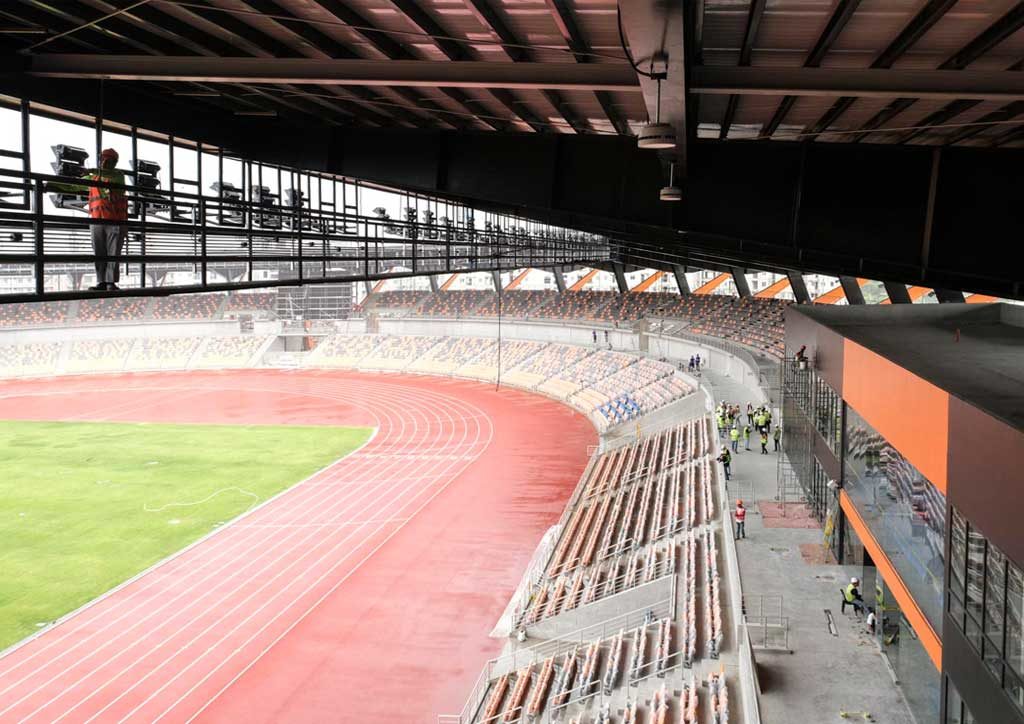 29 July 2019. Although co-developer and contractor MTD Philippines had already committed to turning over the Athletic Stadium two months earlier than the government’s October 30th deadline, MTD president Nicholas David has been pushing to turn over the facility earlier still, by August 15th, rather than August 31st. “We heard reports that the tracks where our national athletes have been training for the SEA Games actually hurts their feet and legs. The track is so bare and so packed, it’s like they’re running on stone. That’s very bad for our guys! I said we have to get them training here in New Clark City as soon as possible.”The weather was not cooperating with David’s sense of urgency to finish the Stadium early, but from what BluPrint saw on our second visit to the New Clark City Athletic Stadium designed by Budji+Royal Architecture+Design, it appears his team will be able to pull it off.
