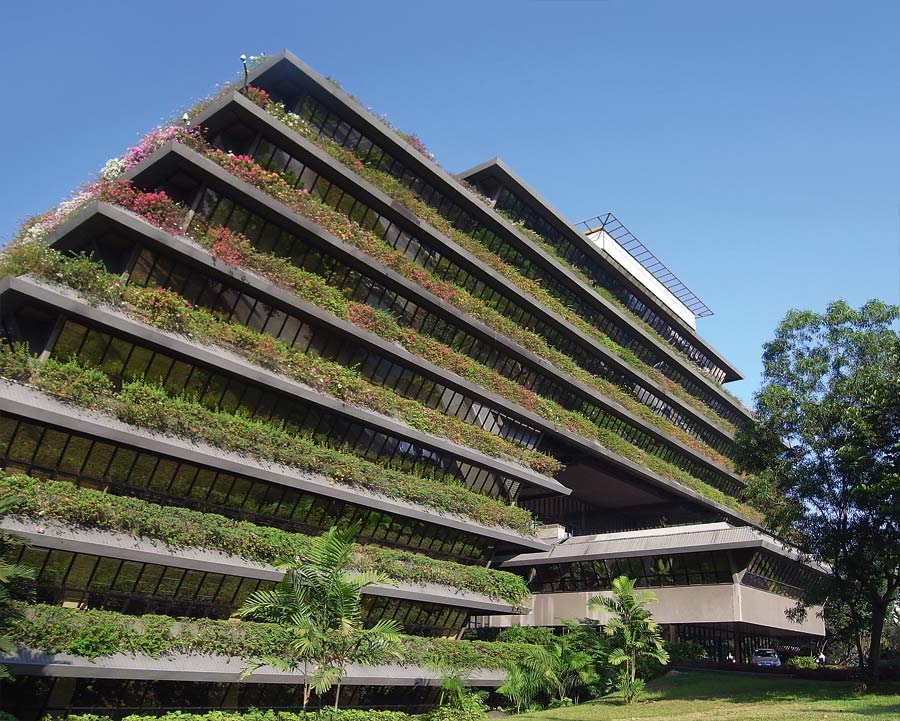 San Miguel Corporation Headquarters, Ortigas Center, Pasig by Manuel Jr., Jose and Francisco Mañosa, constructed in the 1980s. Landscape design by IP Santos. (Photographed by Paulo Alcazaren)