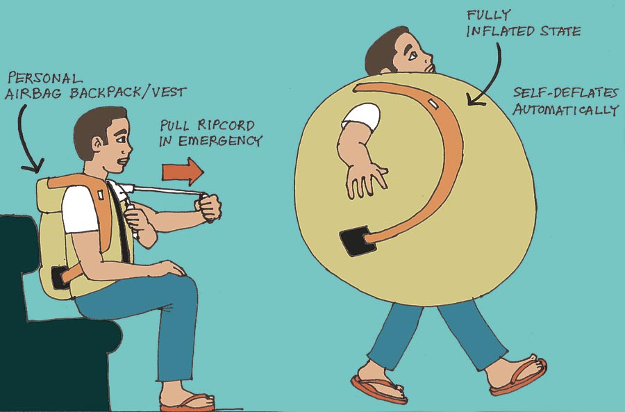 Personal Airbag – In the inopportune event of a strong collision, absolutely nothing will keep you from flying off your seat and getting hurt unless you have a death-grip on the handrail and have been diligent with your core workouts. This personal airbag built into a backpack inflates fully around your torso a fraction of a second after pulling a ripcord, protecting you, and maybe a few other co-passengers from possible serious injury.