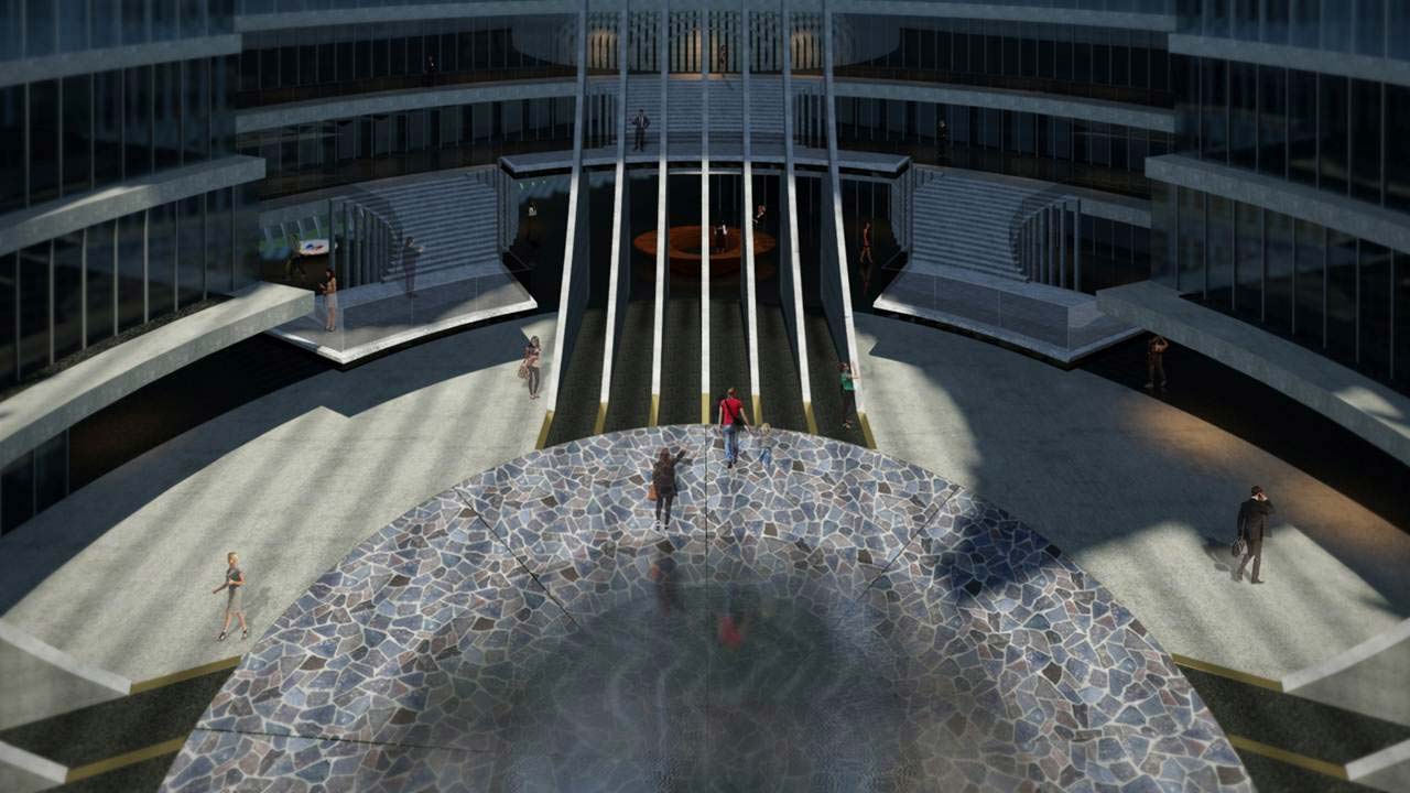 This proposal allows for public engagement while maintaining a level of security that likewise addresses contemporary safety concerns. The structure does not have a singular objective form but is rather a composition of structural members that collectively create an optical illusion. The individual building components are atypical yet are seemingly symmetrical when composed together. The design strategy capitalizes on juxtaposing opposite polarizing concepts to compose a balanced equilibrium implying non-partiality, equality and fairness. The result is an enigmatic assemblage endowed with a dynamic sense of purpose.