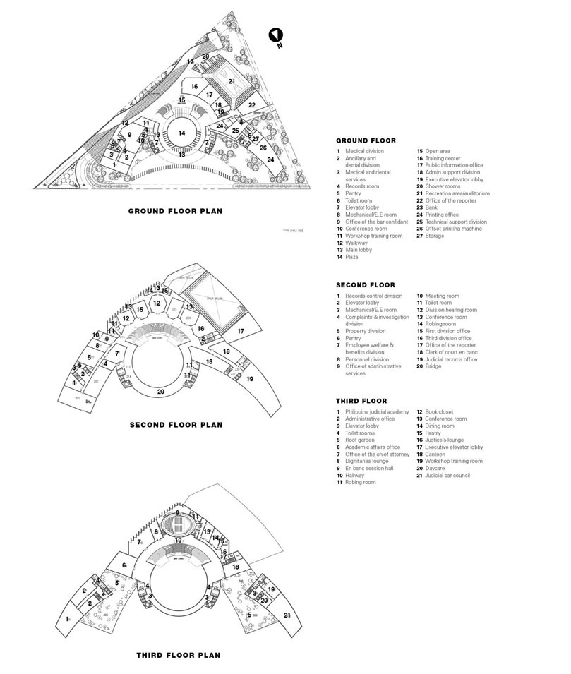 Instead of one large building the proposal is designed with five major segments that converge into a spherical plaza. This facilitates grouping different functions and their adjacencies, so that access by different users can be filtered with greater ease. The spaces and orientations are designed for different levels of engagement with the public: from the casual visitor, organized tours, lawyers, students, liaisons transacting with the different offices, to the different employees, judges and dignitaries. The spherical void will be the plaza collectively enclosed by a portion of each of the different buildings, where the public can see a portion of each department.