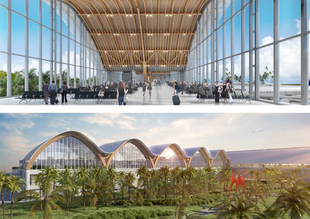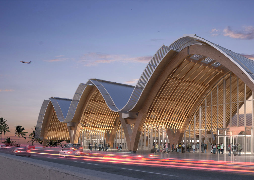 The most distinctive local design intervention can be found in the ceilings of the departure area. Here, a system of free-standing Y-shaped parabolic pillars (reminiscent of mid-19th century iron-and-glass “palaces of industry” in Paris and London), x-braced rafters, and parallel “floating” braced beams, all made of glulam (glued laminated timber) will dominate sightlines and perspectives. The ceiling composition is the closest visual metaphor for the surrounding islands’ rich legacy of craftsmanship in wood and rattan. The glulam’s warm colors, ranging from blonde ash to coffee-brown mahogany, offset the cold efficiency of the terminal and give it a rustic flair that could only be bested if wall-sized aquaria, reminiscent of those in the old terminal, would be introduced to showcase the country’s rich marine biodiversity.