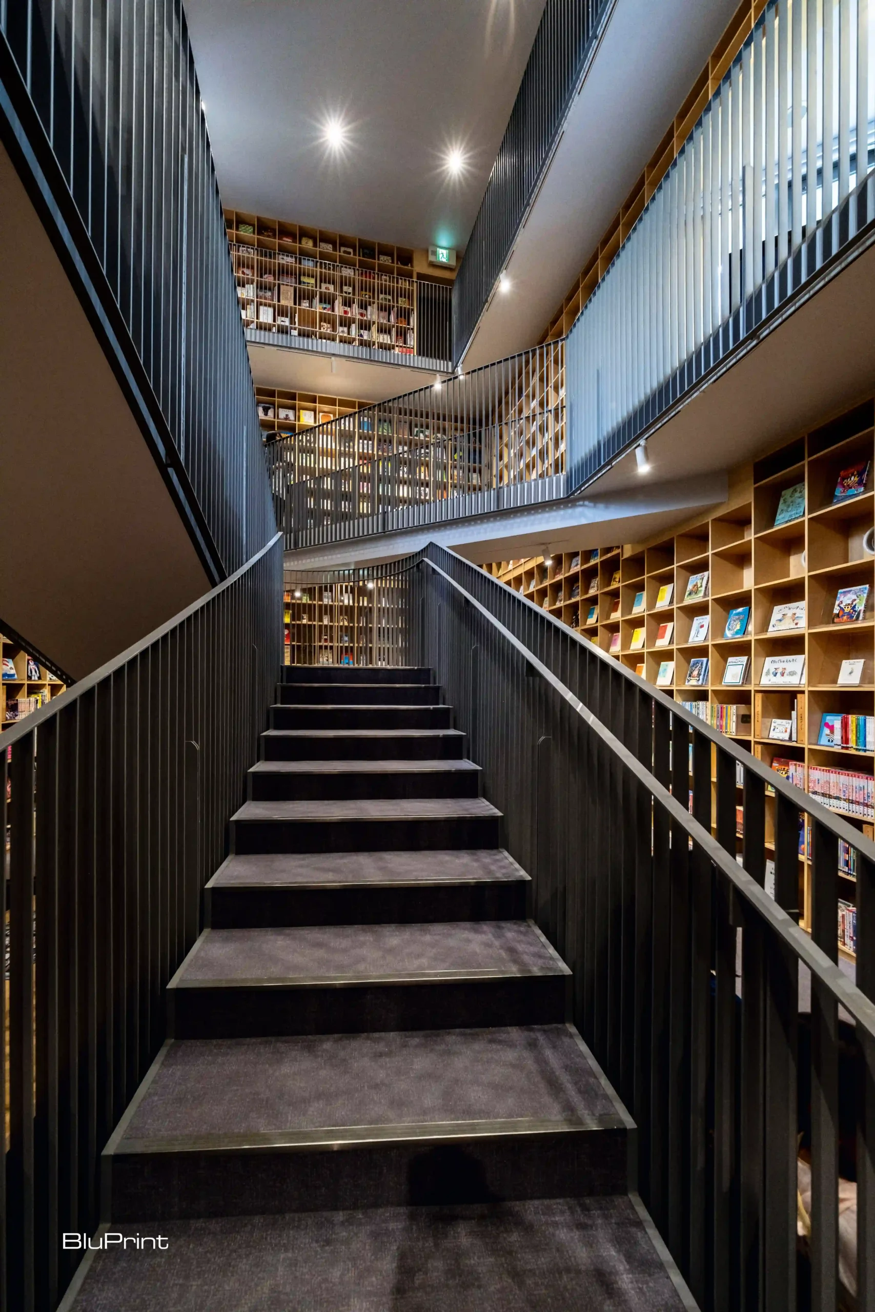 Upon entering, the library’s central, defining feature immediately envelops visitors: a soaring, triple-height atrium lined with floor-to-ceiling bookshelves. These walls of literature curve dynamically to follow the building’s arc along the river, rather than being static or flat. This powerful gesture creates an immersive, all-encompassing environment that lives up to the building’s name. It is a literal forest of books, where the sheer volume and presence of stories, knowledge, and art inspire awe.