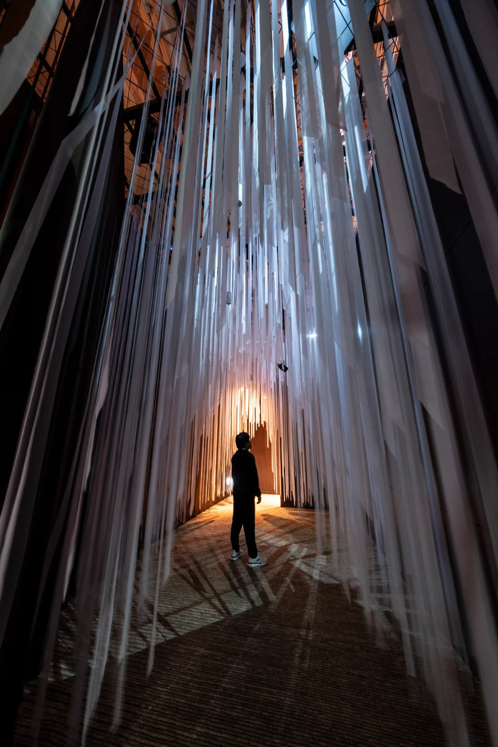 One month in, over 150,000 people have walked through its woven skin. The installations are still the same—the AI wall that turns your silhouette into bouncing blooms, boogying bananas, or swaying schools of fish; the woven facade of 212 panels from 121 communities. But the energy has shifted. Not for first-time visitors, but for those who perform, host, and hold the Pavilion daily. The nerves of opening week have given way to rhythm, instinct, and a kind of quiet stamina.