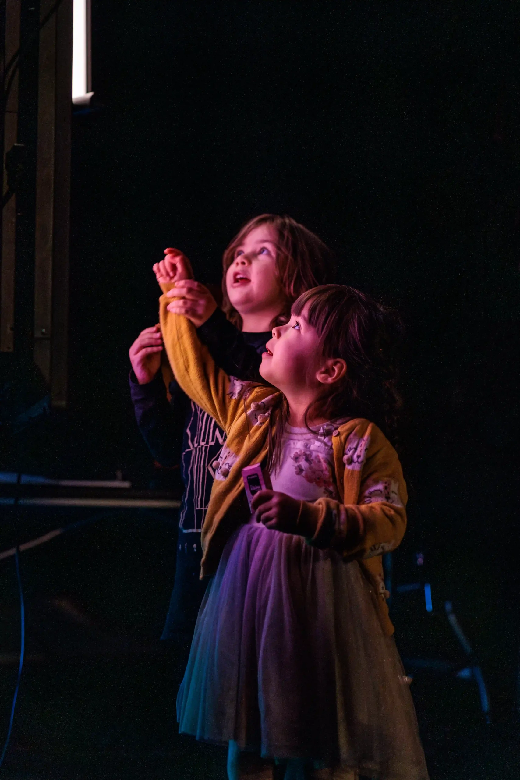 Left: Children gaze up at handwoven scrims—each a story stitched from memory and place. Right: A visitor stands still as light and shadow ripple through the Pavilion’s woven threshold.