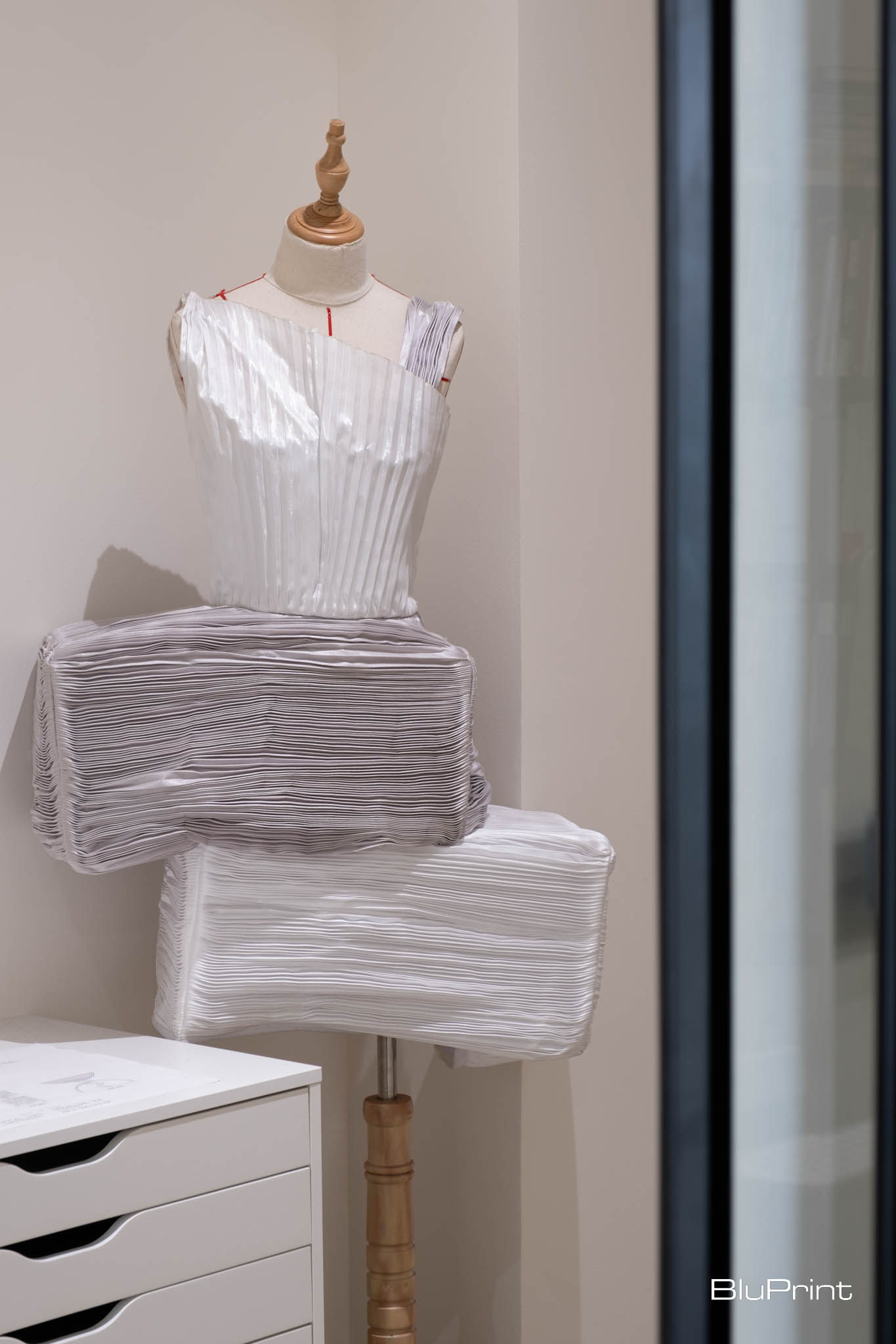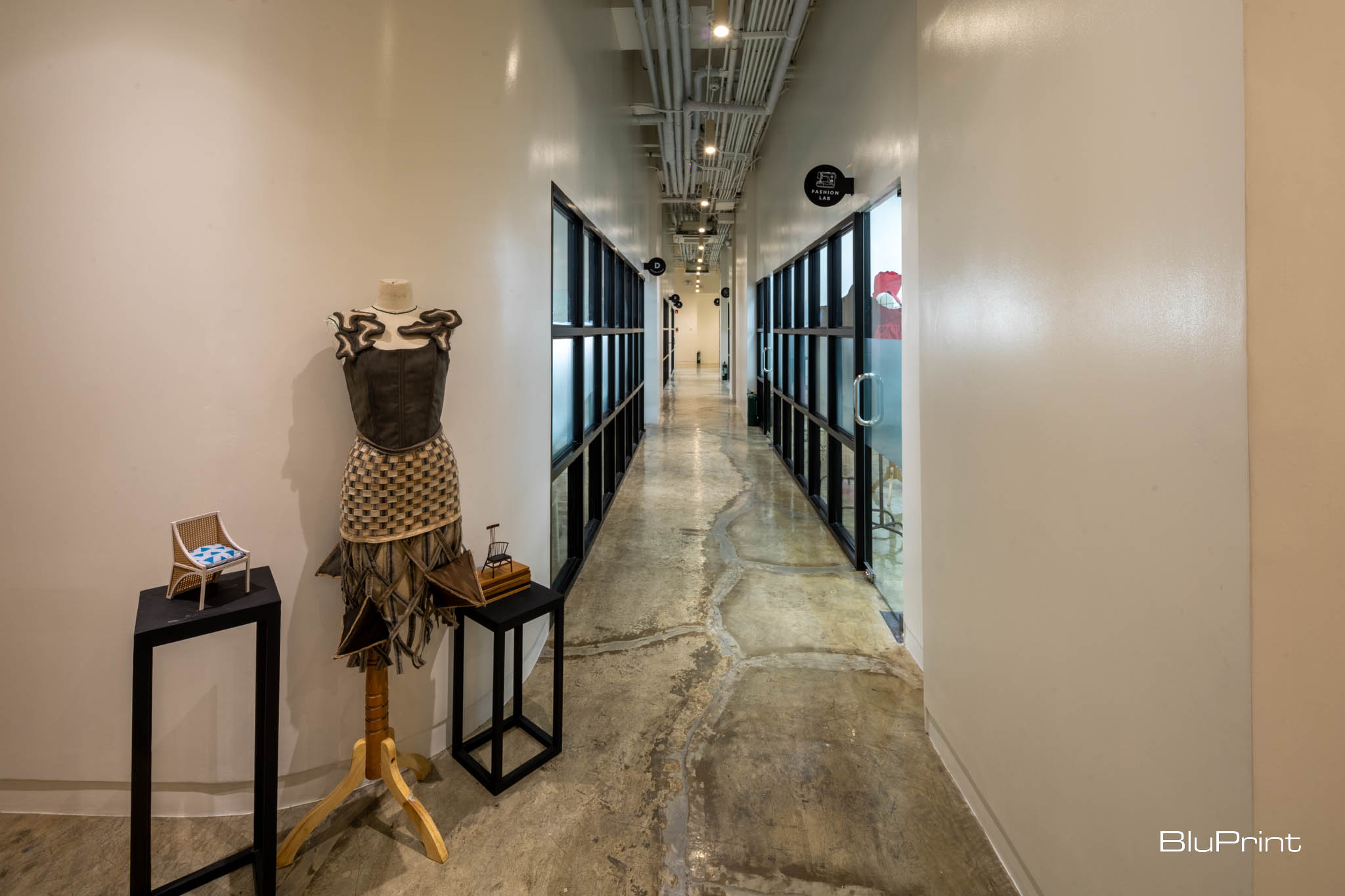 Classrooms are located in the back. The fashion lab, tailored to the needs of fashion students, features sewing machines, cutting tables, and display areas for showcasing garment designs. The lab mimics a professional fashion studio, providing students with hands-on experience and industry-standard equipment.