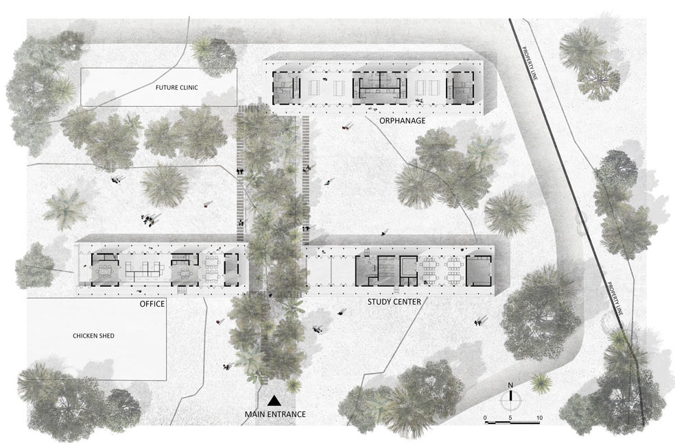 The study center has teachers’ offices, a music room, library, kitchen, and bathrooms in the heavy volumes; and it has classrooms with areas for song, dance, and theatre in the spaces in between. As such, the new study center serves as the public face of Streetlight and is the space that connects them with the larger community of Tagpuro.