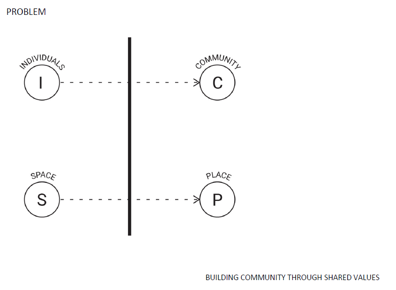 We realized through the whole process that there are both tangible and intangible barriers that prevent the natural transformation of individuals into a community and of space into place. The goal of our collaboration then is to use the design process as a catalyst to form shared meanings, which allow the formation of a community with shared values.