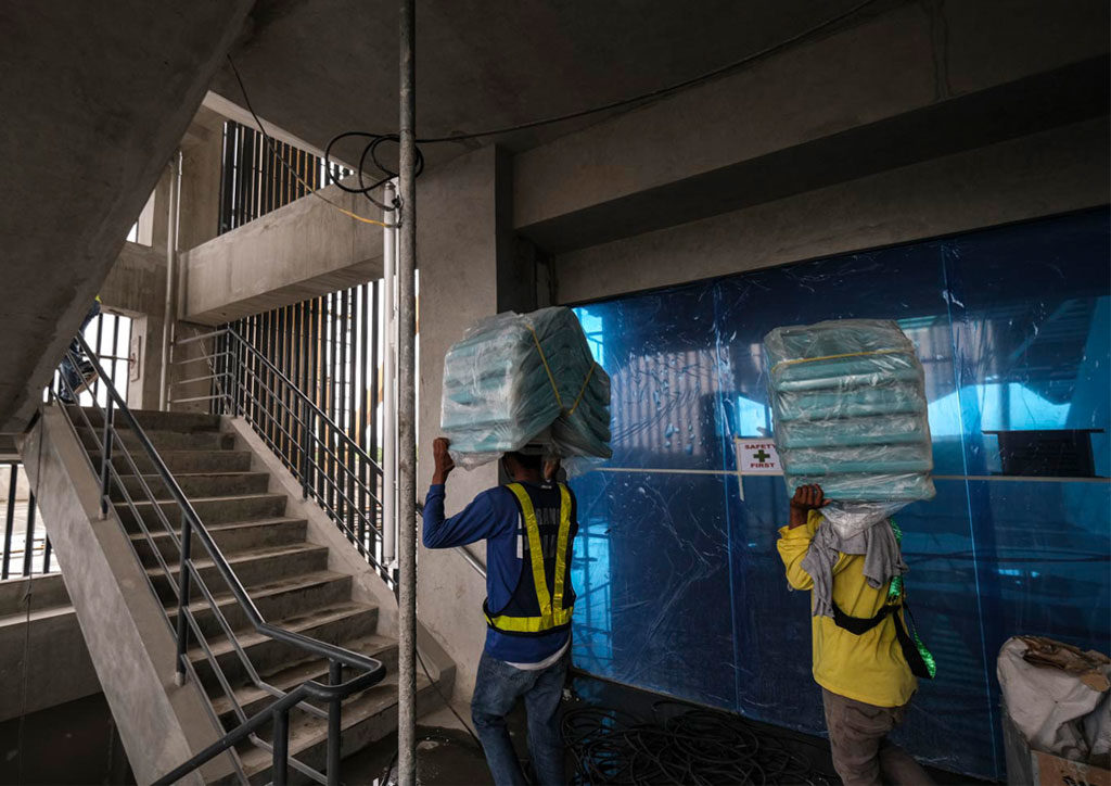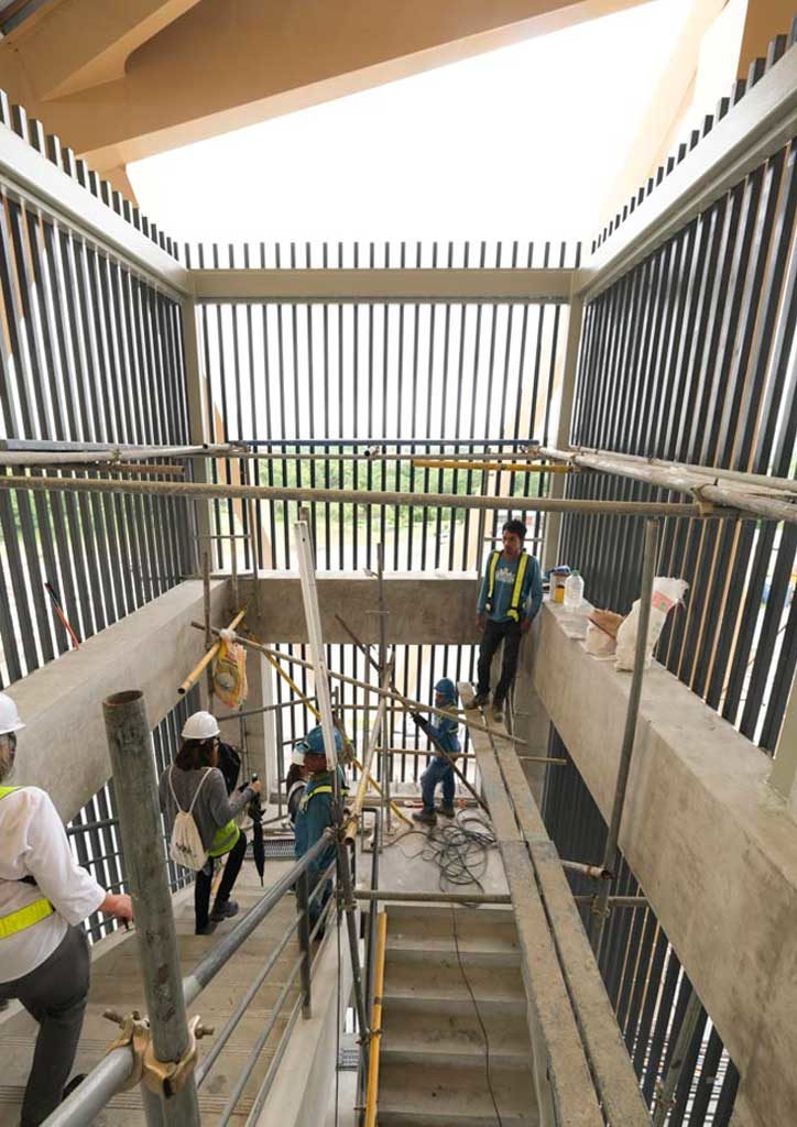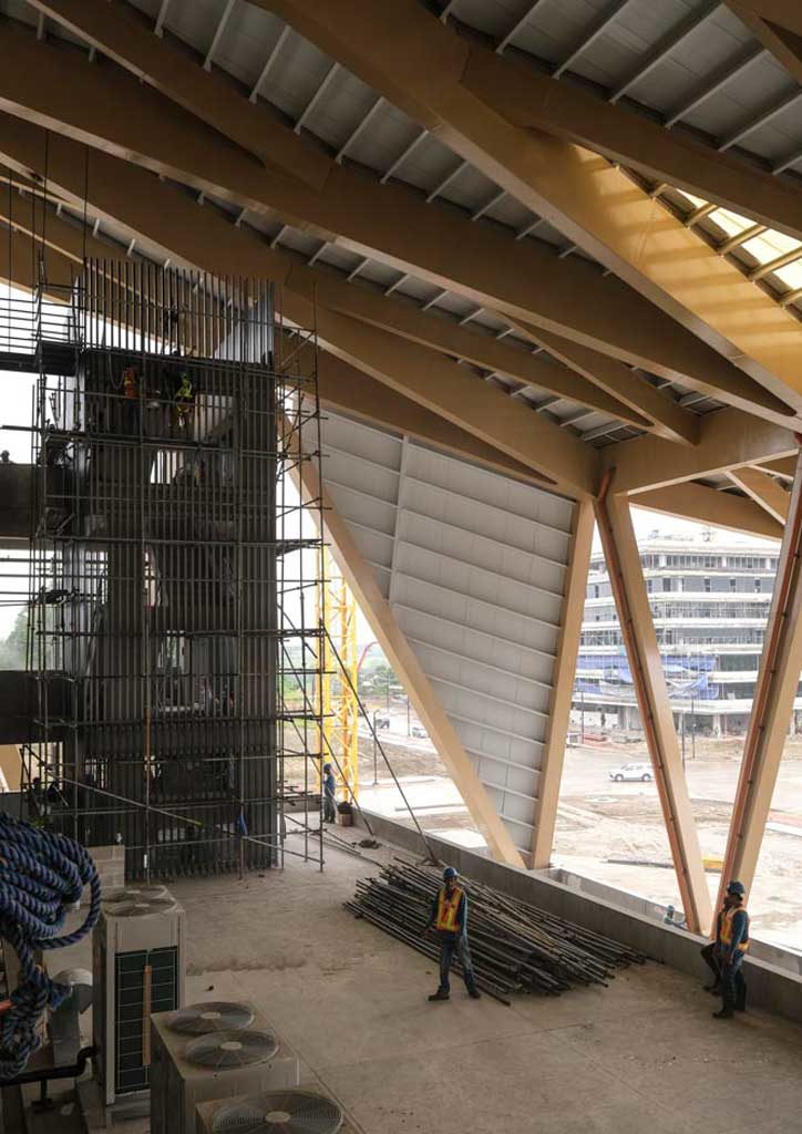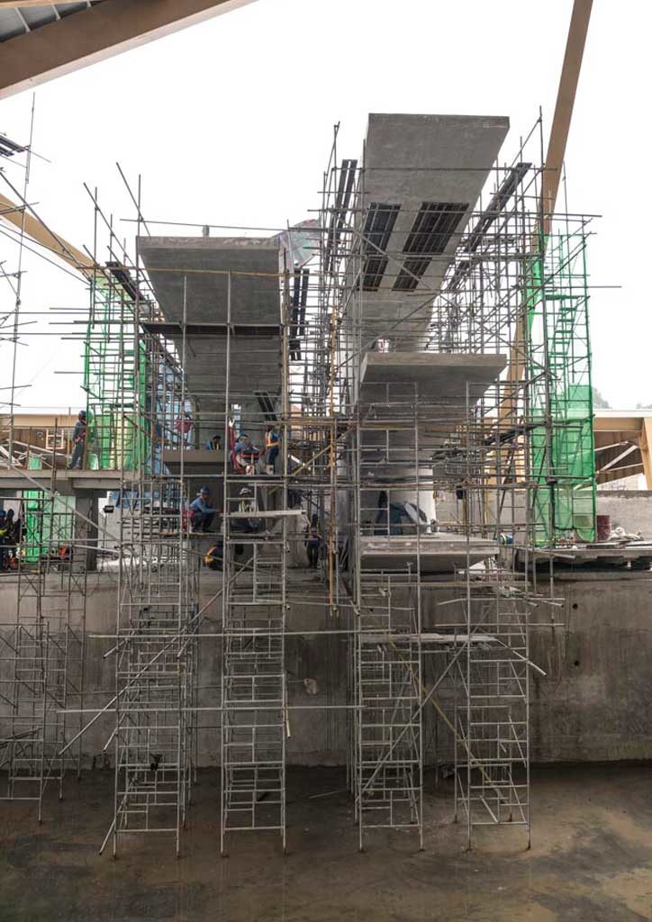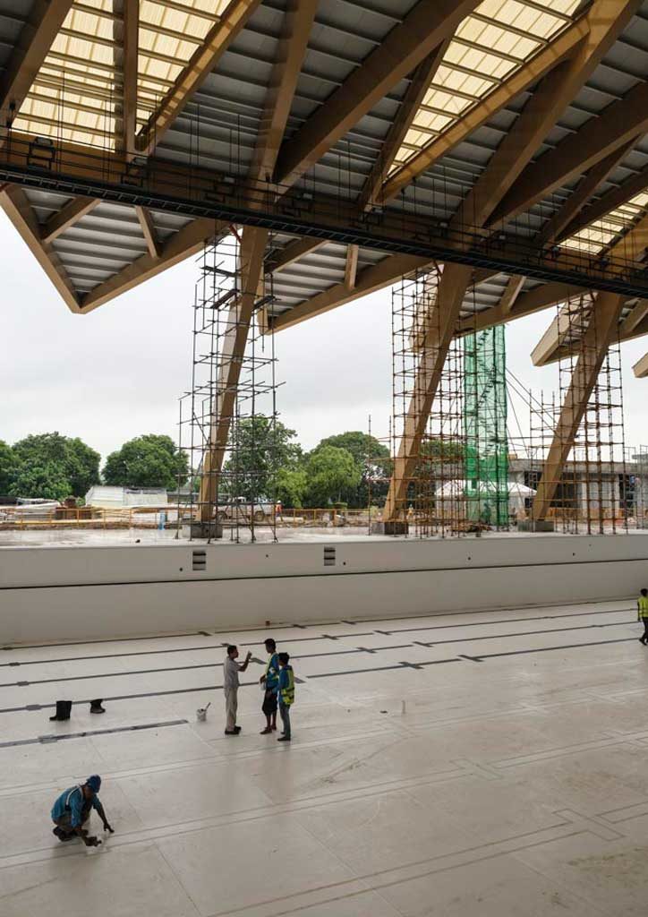July 29, 2019, two months after our first visit to the New Clark City Sports Complex, the site couldn’t be any more different. The rainy season was in full force at the 2019 Southeast Asian Games’ main venue. The sky was overcast with clouds heavily laden with rain, and the soil was soaked and muddy with puddles of water where the earth undulates, a contrast to the parched landscape we first visited, where clouds of dust swirled whenever our shoes hit the dry ground. But the downpour had no effect on the speed with which the 7500 men worked to complete all the buildings in the complex by 31 August.