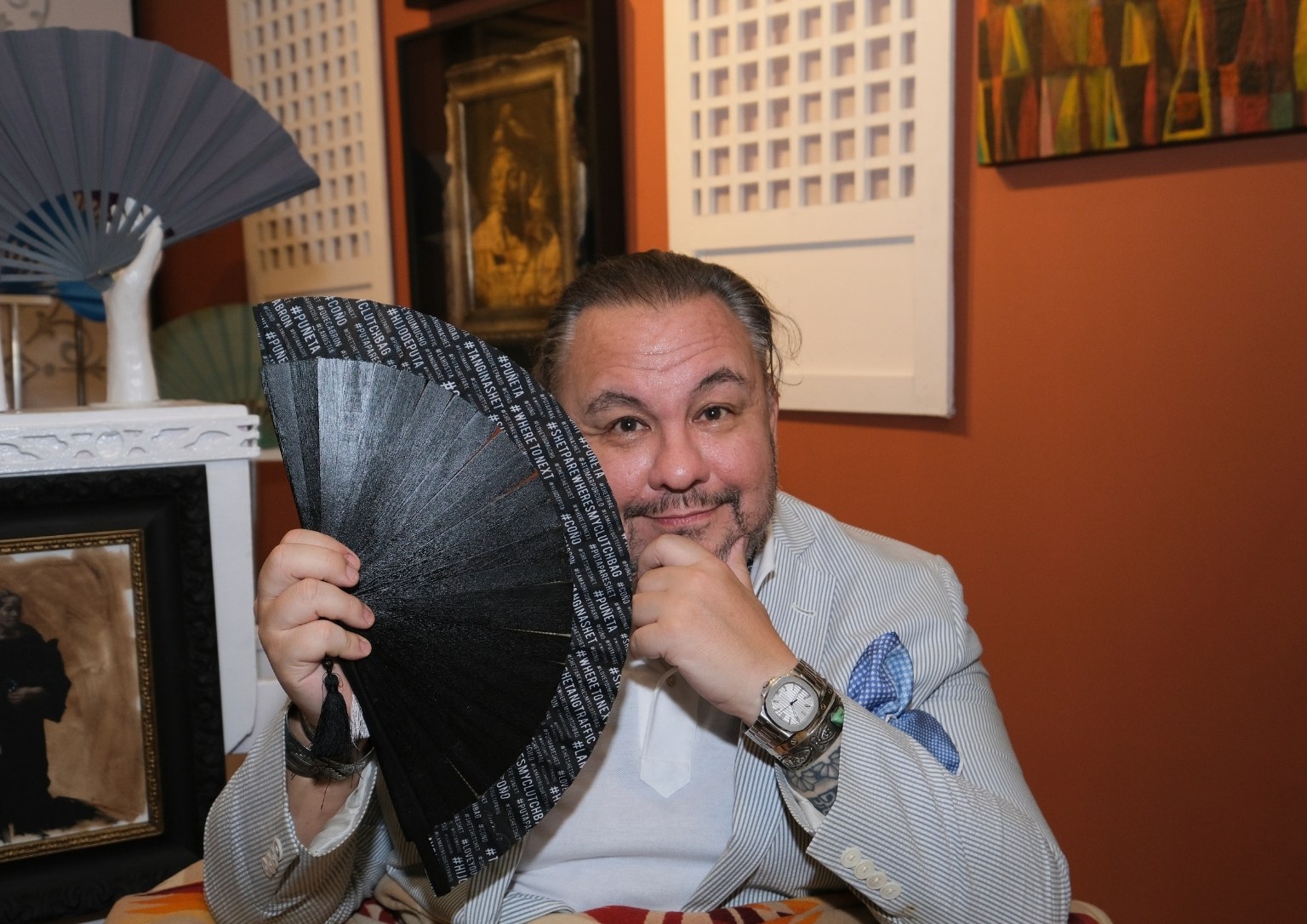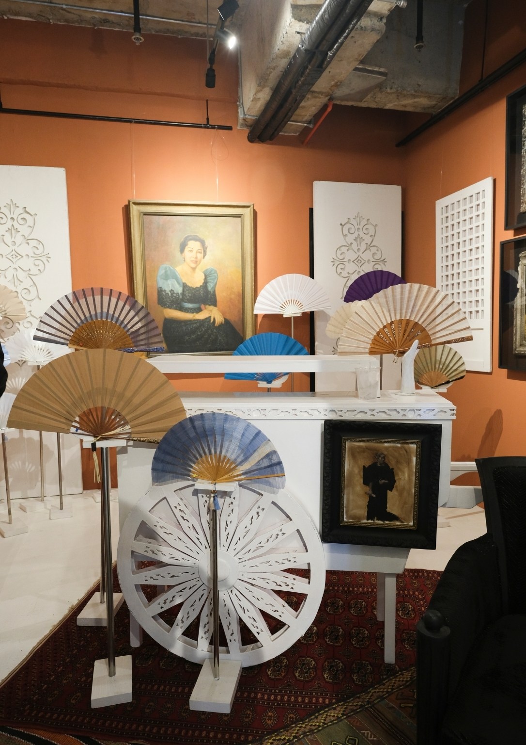 Monchet Diokno Olives. Popularly known as “The Fan Man”, Monchet is a heritage fan maker and also a very notable figure in the art and design scene. He finds luxury in simplicity and this is exactly what his booth exemplifies. Inspired by fans, the whole concept of his booth takes on the Victorian era where fan language is very important. He explains that a fan does many faces, it could express the emotion in more ways than one. This is also the reason why the choices of art pieces in his booth are all portraits. He claims that the blindfolded portraits of a king and a queen are his favorite pieces. He describes it as the most striking, and to him, it is a political statement more than an art piece. He explains that the king and the queen should see the reality of what is happening. He goes for something a bit radical and chronicles his booth as such.