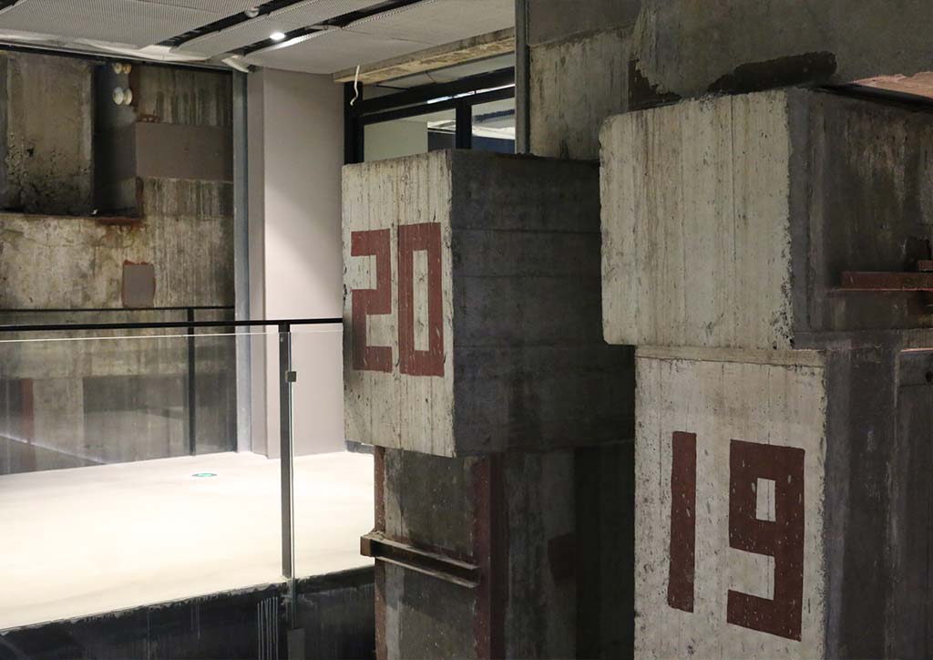 Hints of the Building’s Shipyard past can also be seen through exposed pipes integrated with wayfinding graphics, markings indicationg bay numbers and worker’s staircases used as viewing points.