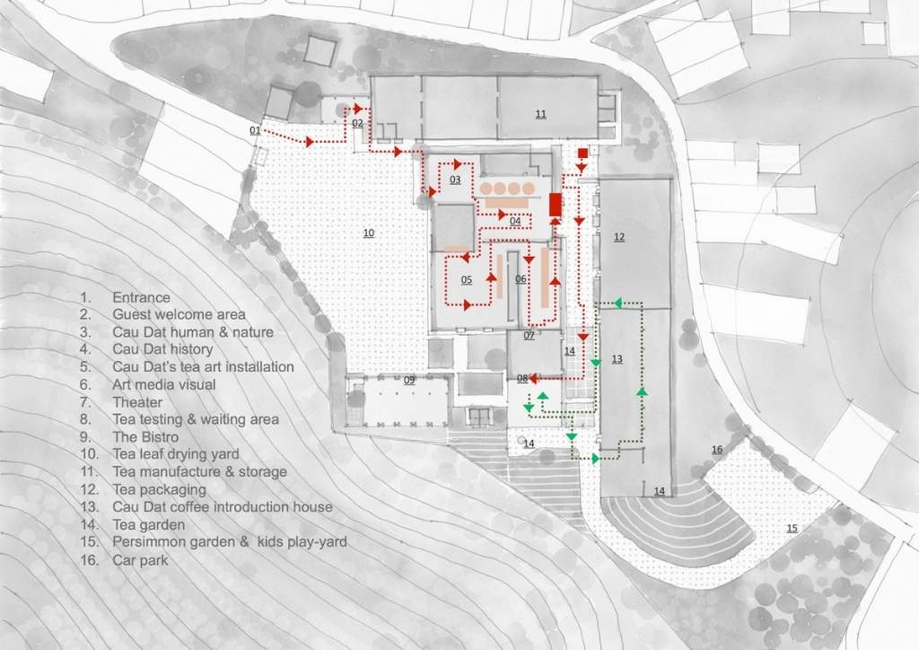 The old factory has four buildings which the architects saw as visible connections to the farm’s long history. These historic structures, they noted, tell stories that anyone can experience, which in turn creates a feeling of belonging. With this in mind, they made the oldest structure — the main manufacturing warehouse — as the main cultural hub for those who want to learn more about Vietnam’s tea culture.
