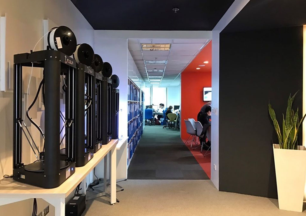 Aidea’s bank of 3D printers photographed in 2019, pre-COVID-19.