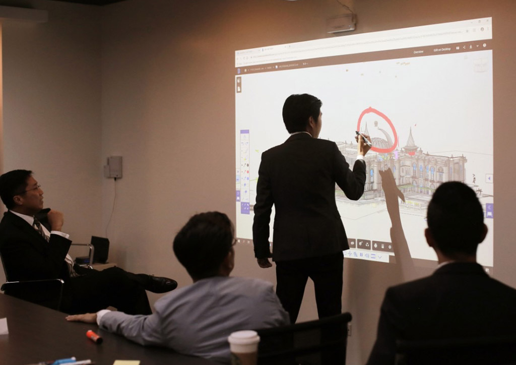 Collaboration in Aidea’s boardroom with interactive projector, 2018. Mark-ups on the projected plans may be recorded, stored, and revisited.