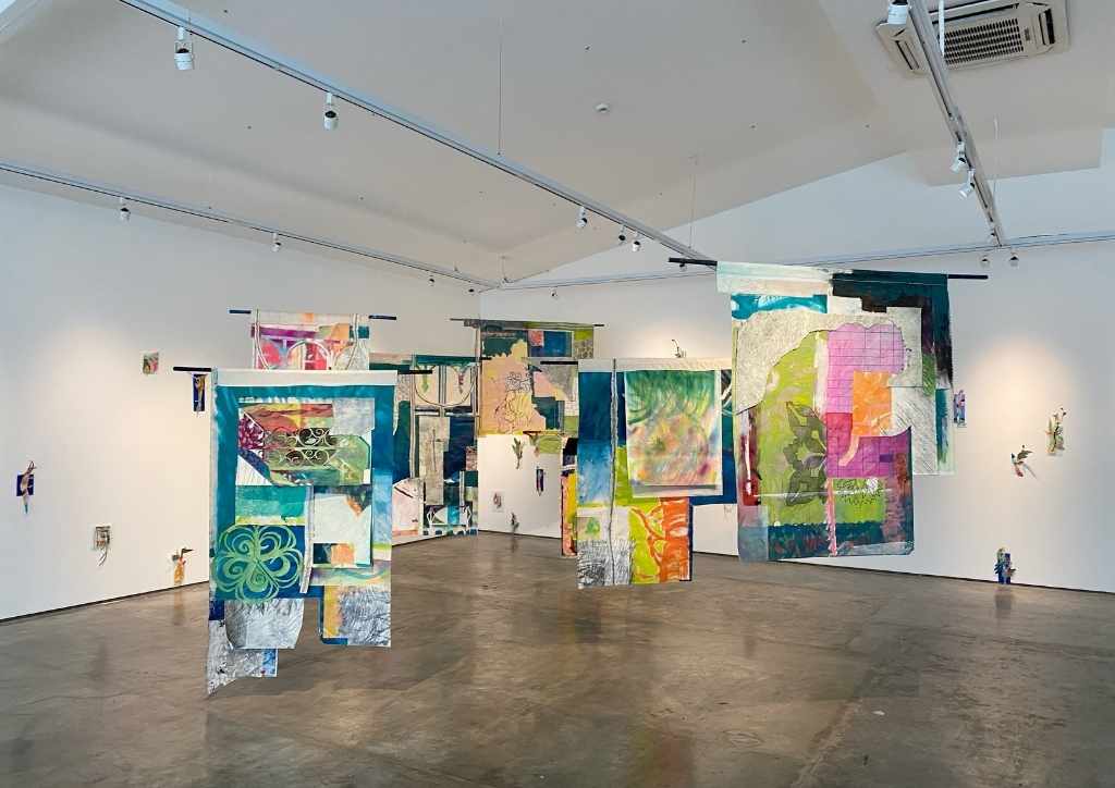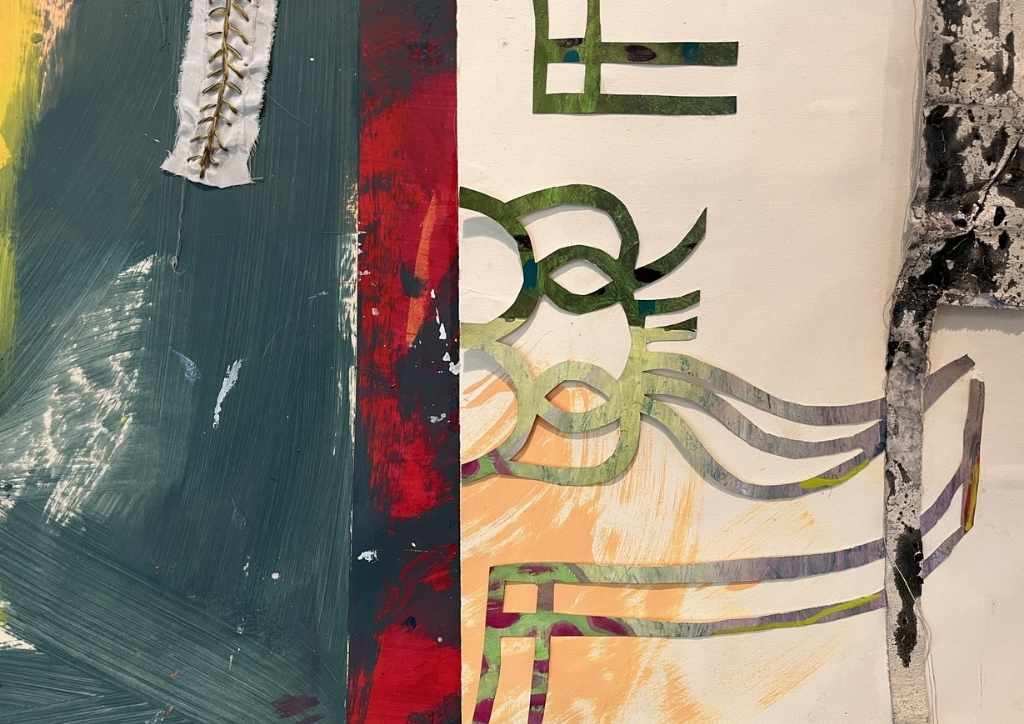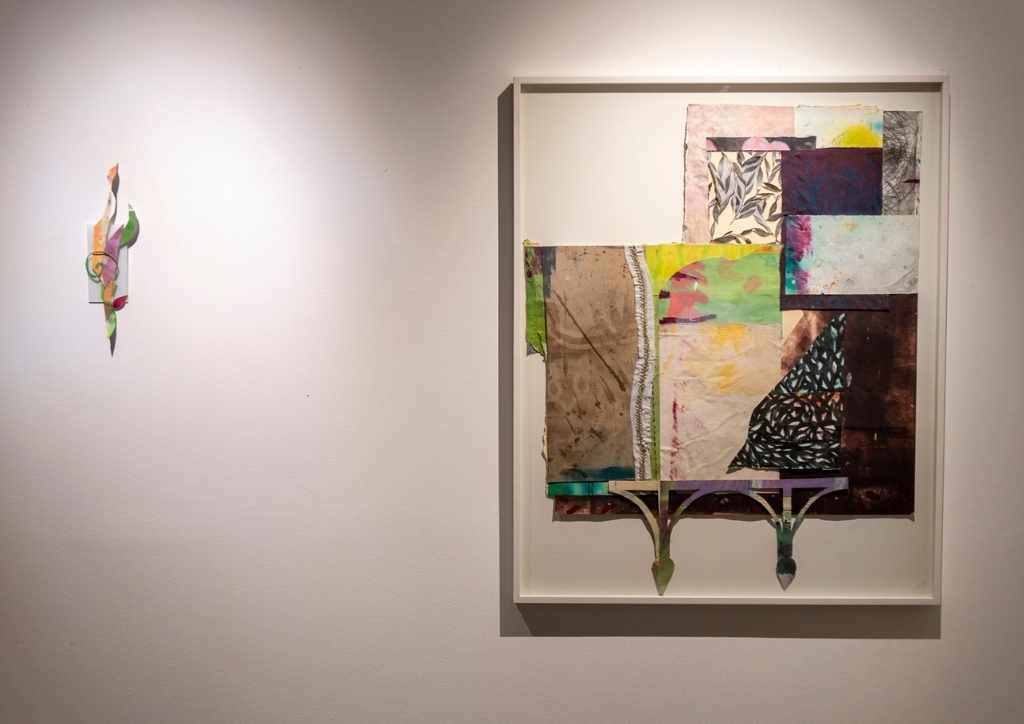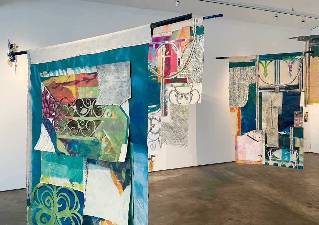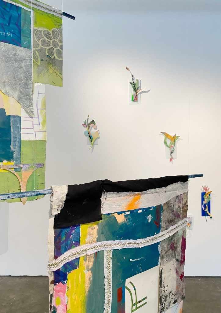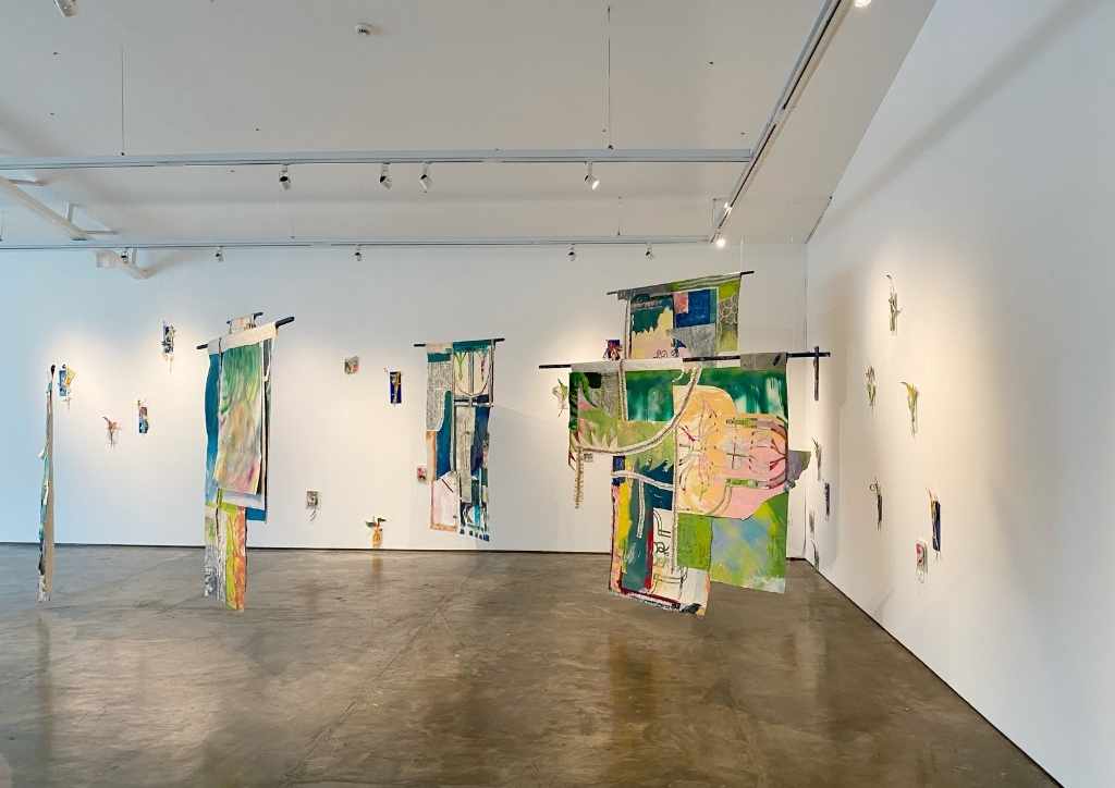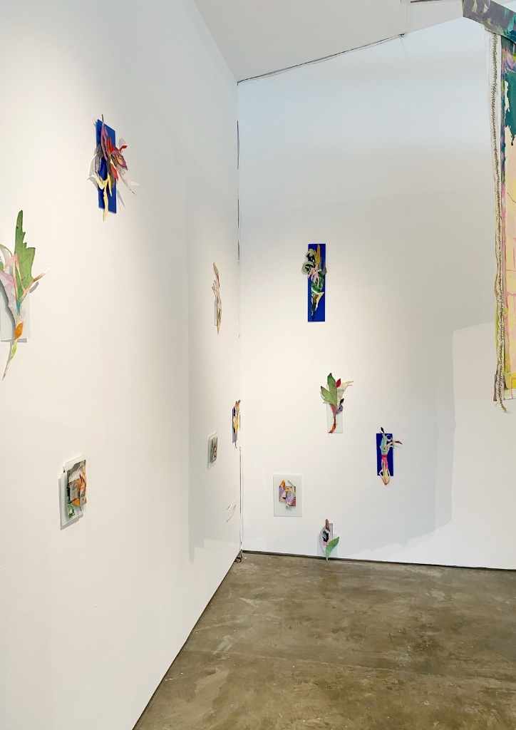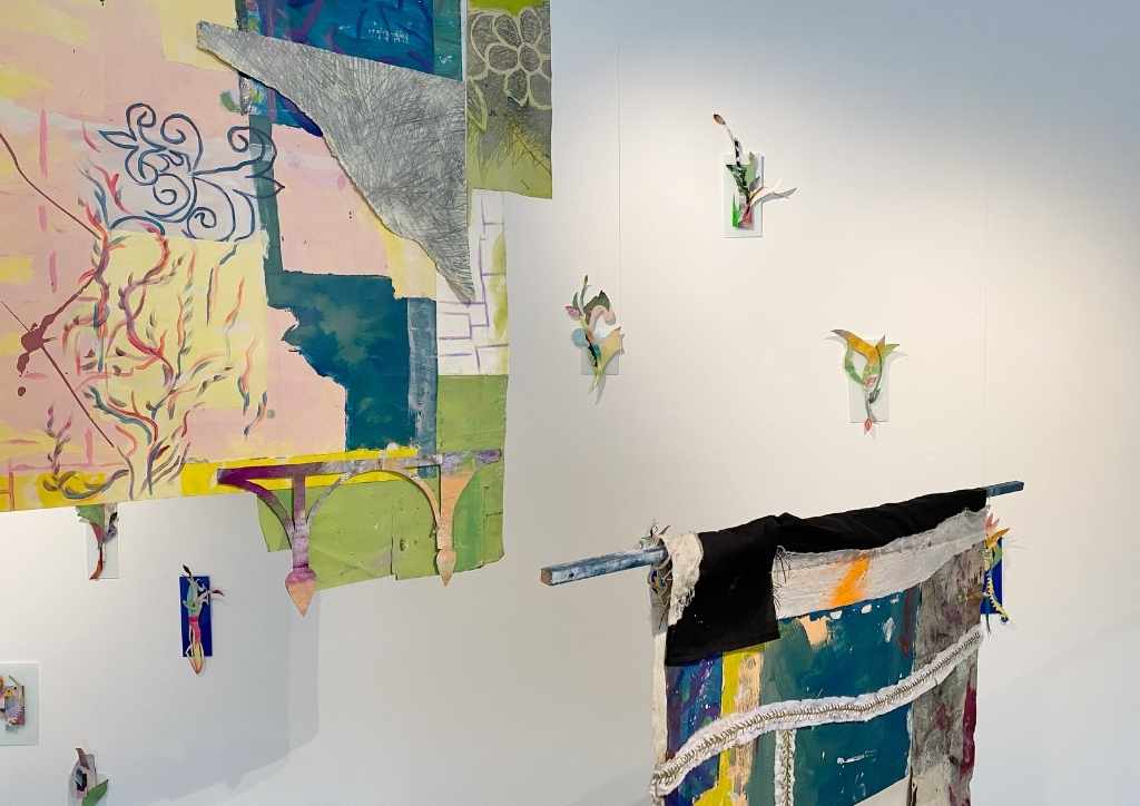 For this show, Brisa made use of collages, fabrics, embroidery, and repurposed old works to depict the flourishing of plants against urban spaces and elements. As the title suggests, plant-like curves and shapes interject the jagged forms and cuts of an inorganic environment.