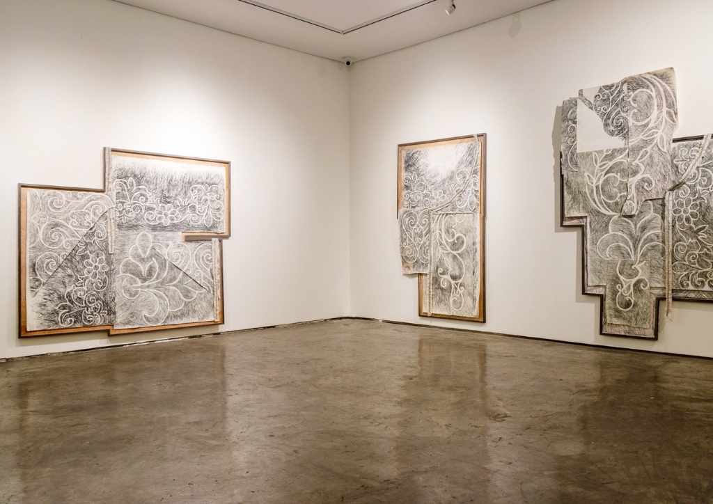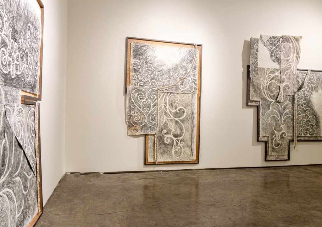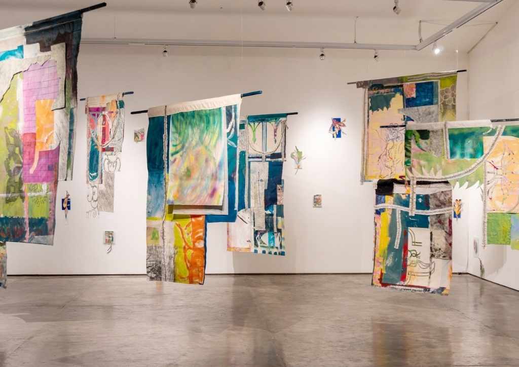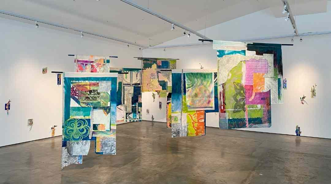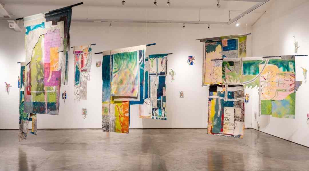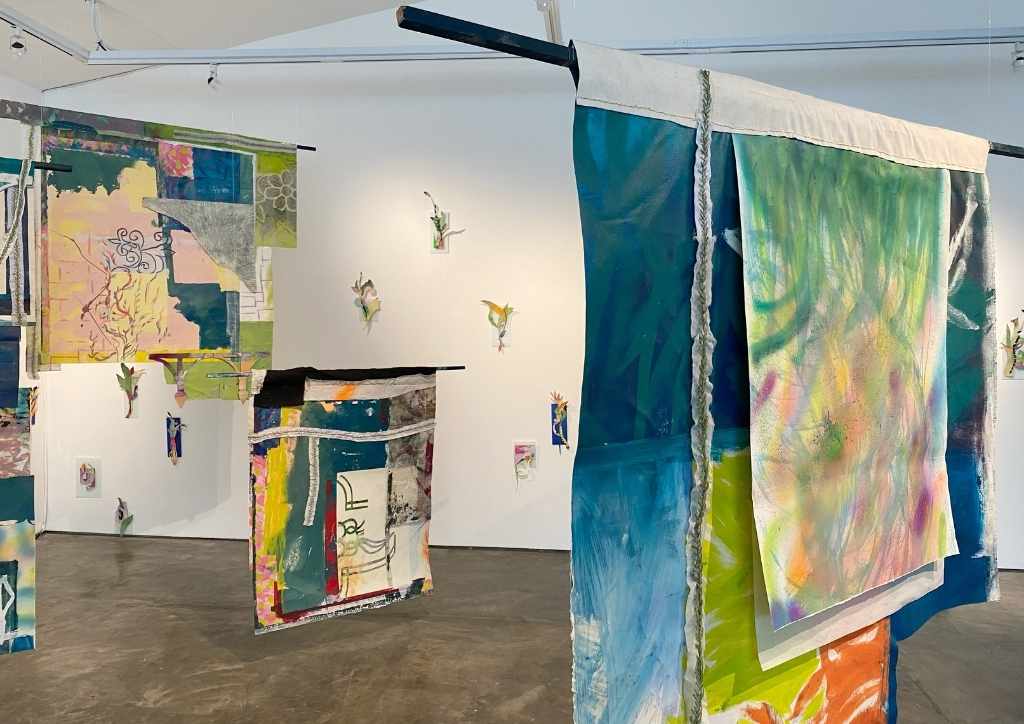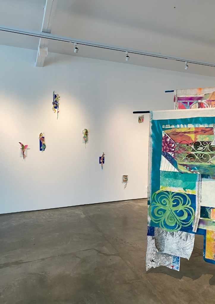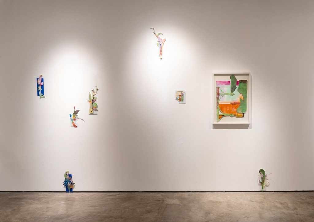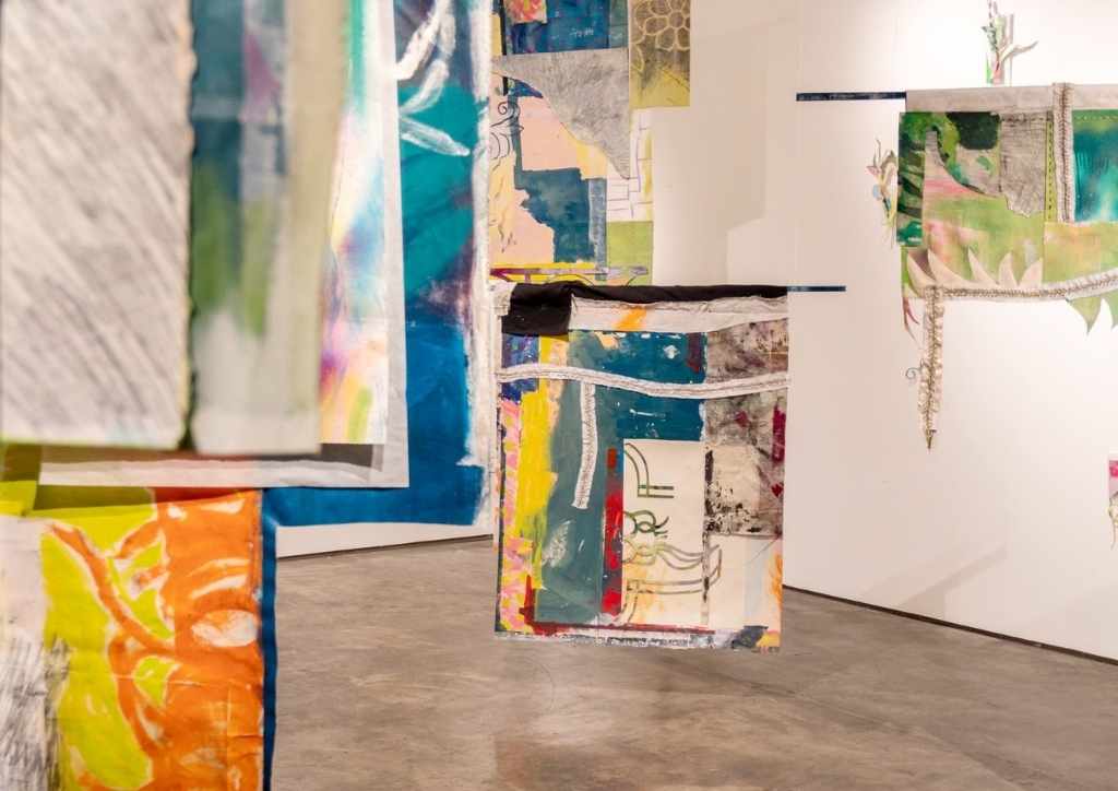 For this show, Brisa made use of collages, fabrics, embroidery, and repurposed old works to depict the flourishing of plants against urban spaces and elements. As the title suggests, plant-like curves and shapes interject the jagged forms and cuts of an inorganic environment.