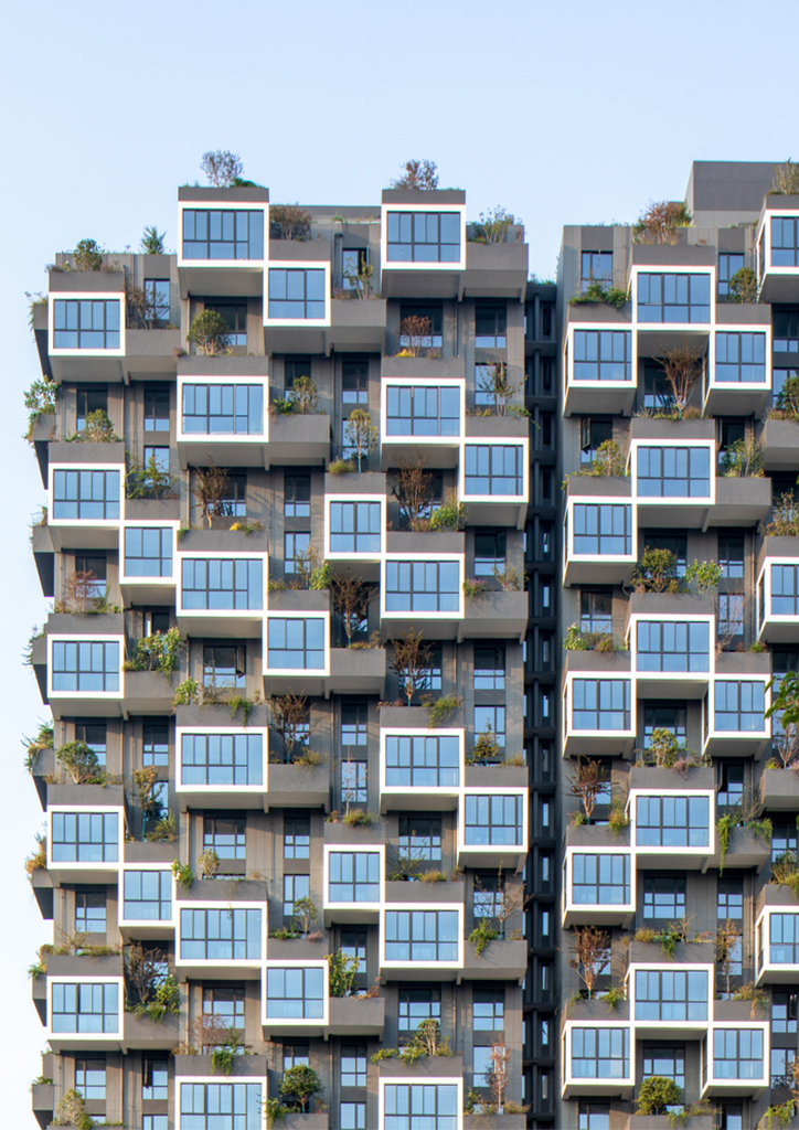 The complex, with its five towers, covers an area of 4.54 hectares. Two towers are residential and bear the vertical forest design. Designed to cater to the needs of different individuals, the complex also includes spaces for tourists and temporary guests. Three streets surround the complex, while each of the distinct areas connects to an open public space. The ground floors of the towers showcase façades mostly clad in vertical and modular elements. This design creates a visual effect of rhythm and dynamic movement. The commercial area also has a spacious semi-public greenery to align it with the vertical forest of the residential towers.