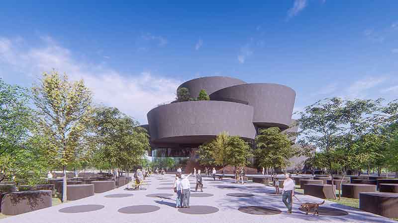At the foreground of the structure is a vast open space covered with round slabs, arranged radially, symbolizing countless unnamed victims of this period. The façade also pays homage to them, with an interspersion of solid surfaces and transparent glass enclosures and sky gardens that allow for light manipulation, and an exterior clad with two-toned stone blocks. It is the hope that as each victim is recognized, one stone is turned from one side to the other, from dark to light, from hopelessness to freedom.