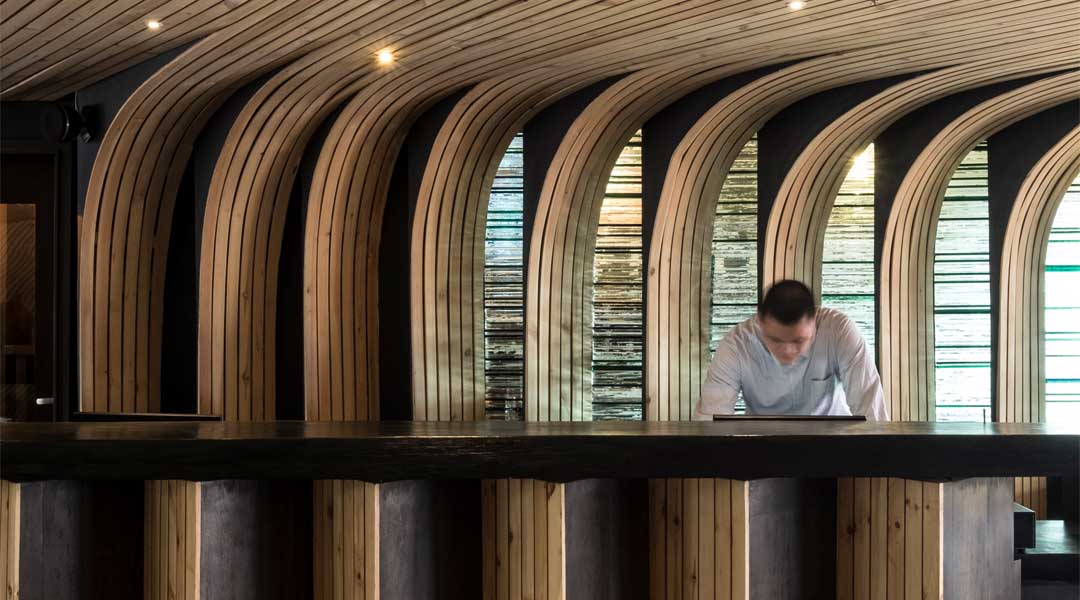 The front desk, an abstraction of the hagabi, is crowned by groupings of timber ceiling strips curving down to form an eye-catching backdrop.