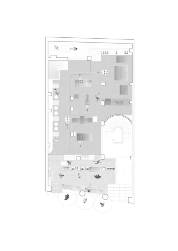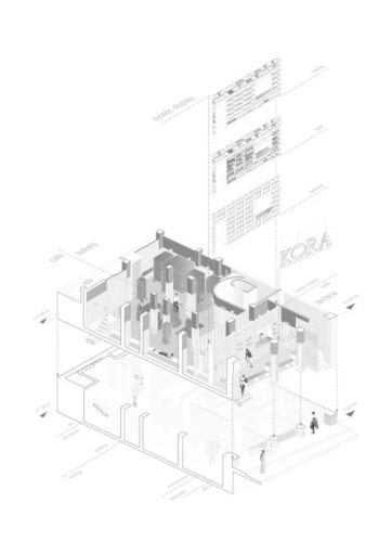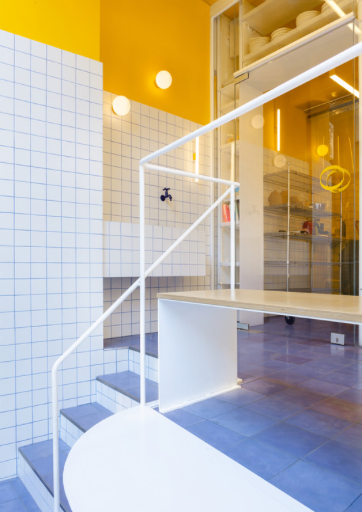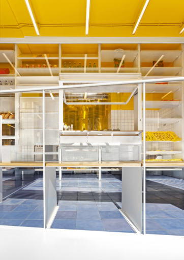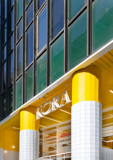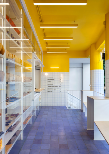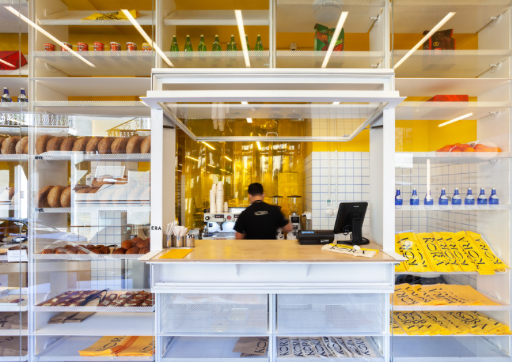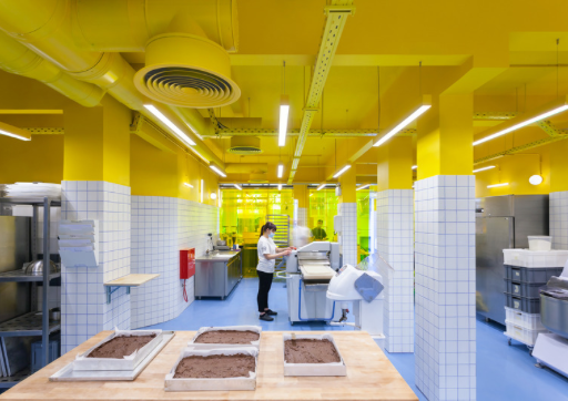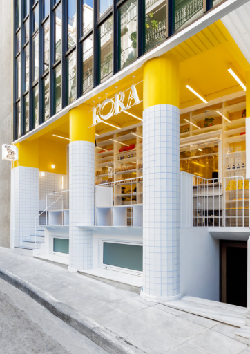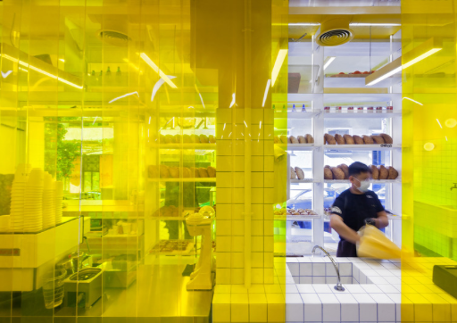 The incorporation of functional elements on the interior complements the perpetually changing presentation in and around the facade. KORA Bakery has turned producing and consuming baked goods into a performance where the boundaries between performers and spectators are blurred.