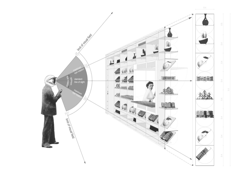 The architect explained that the presentation of these goods and the production process are conceived as a transparent spectacle. These features are perceived through a gigantic wall of rotating metal shelves. The store also has changing scenarios of open, semi-open, and closed facades. These elements allow customers to view different types of products and the production space itself.