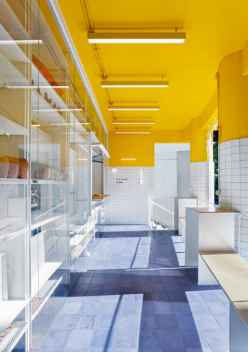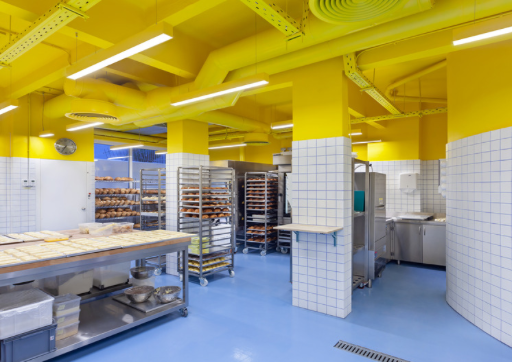 The overall look of the bakery has an impact on attracting customers. Beyond that, food establishments also have to consider the maintenance of the place and keeping it clean. The architect explained hygiene and maintenance played a crucial role in the selection of materials and colors.