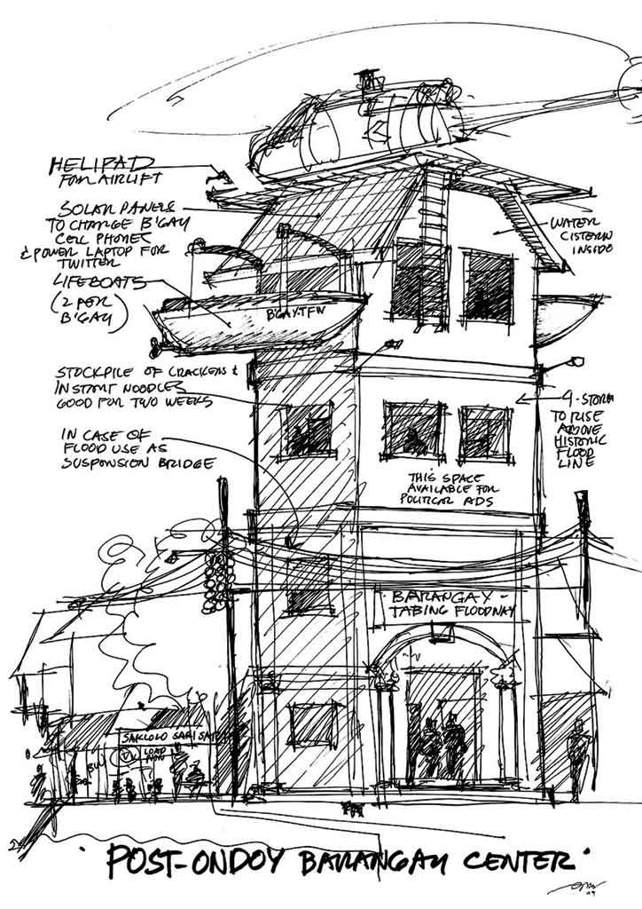 Also suggested were new designs for barangay centers with lifeboats and a helipad. The structures were to be four storeys or at least a storey above the historical flood level high in the area it was to be built. An option too for entrances for gated communities was put forward. Lifeboats were used as roofs for guardhouses, which would shed them for use when needed. Scuba gear and lifesavers were to be hung from the walls making them easily accessible for use.