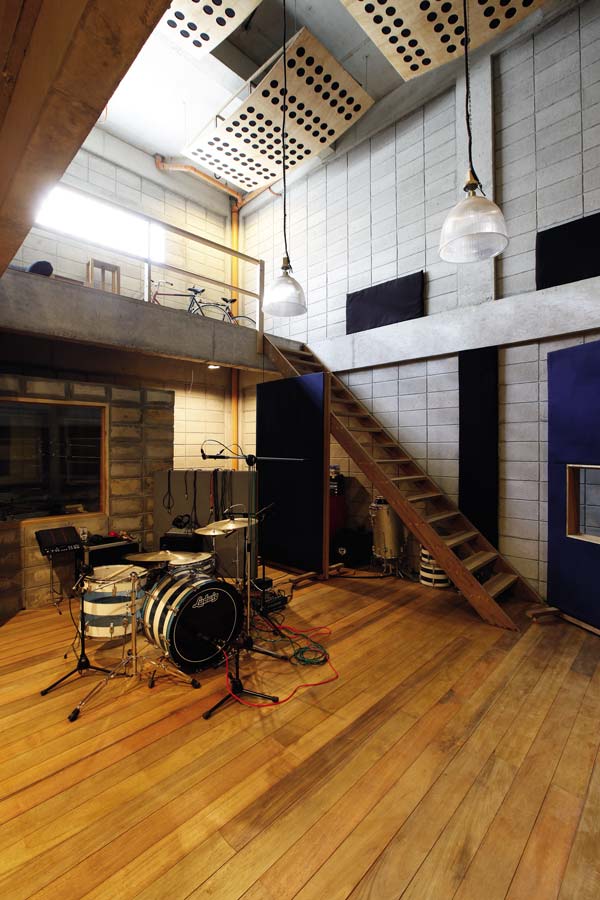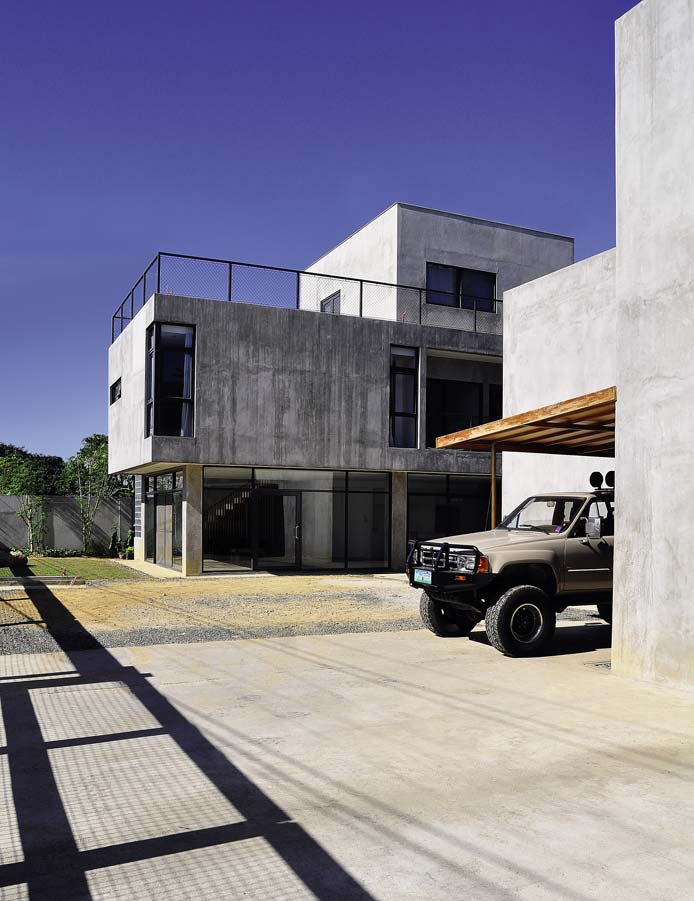 The project is composed of two buildings in a 600-square meter lot—the three-storey residential block that occupies 240 square meters, and the two-storey recording studio block occupying 215 square meters. The client, a Japanese expatriate and prominent recording engineer and artist, confesses that he is drawn to squares and corners. This explains the simple box form of the structures and the “grid” motif present in the entire house, mostly seen in rectangular lines made by hollow blocks, the wall of glass blocks by the stairwell, and the wall-mounted “diffusers” inside the studio.