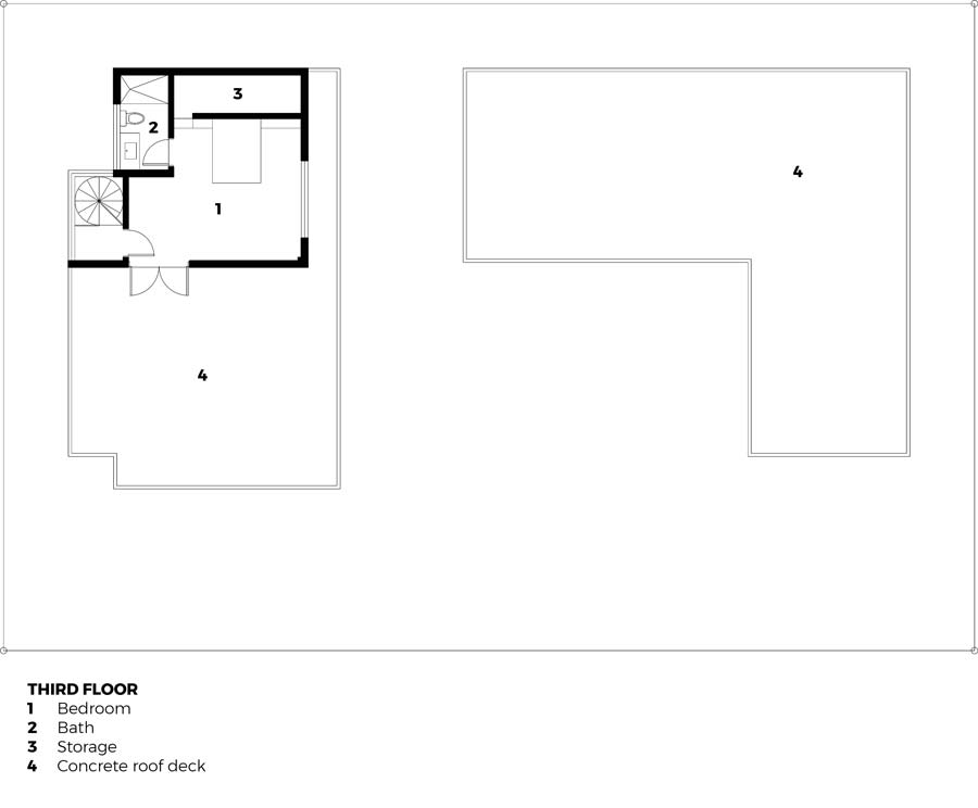 The client’s DIY forays aren’t limited to the recording studio. The wood details in the residential block were custom designed by him, and the nakedness of the material lends a Japanese sensibility to the interior spaces. The wood slat stair railing, the dining table and benches, and the second floor cabinetry are all sanded and unvarnished. Fitting in comfortably with the visual rawness of the concrete, these additions further show how receptive Benedicto’s architecture is to the unconventional preferences of its users.
