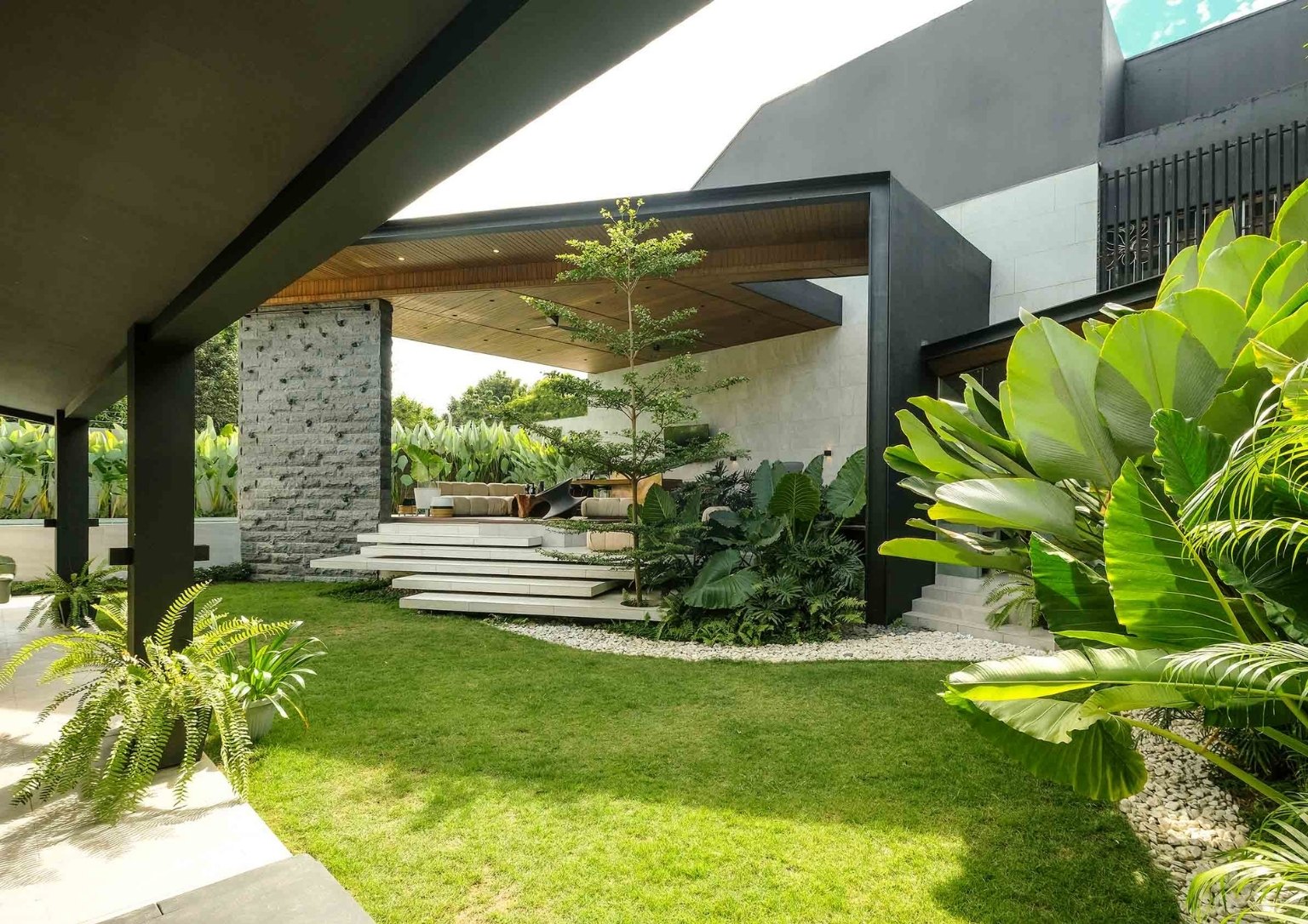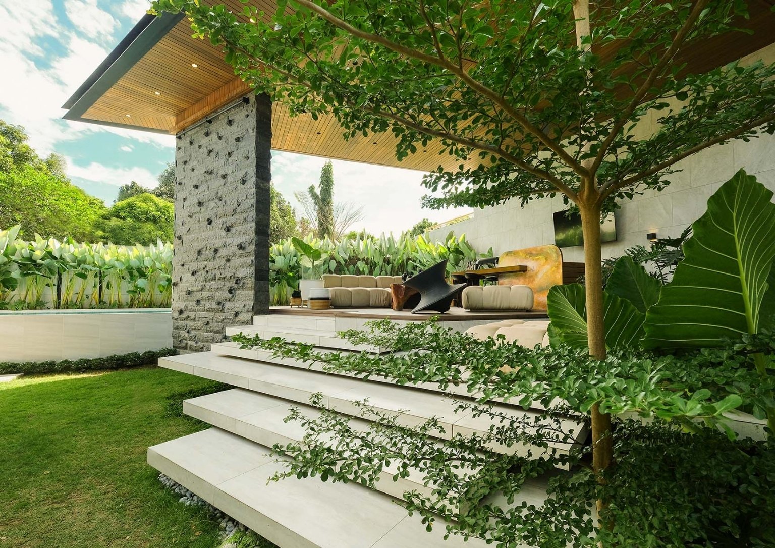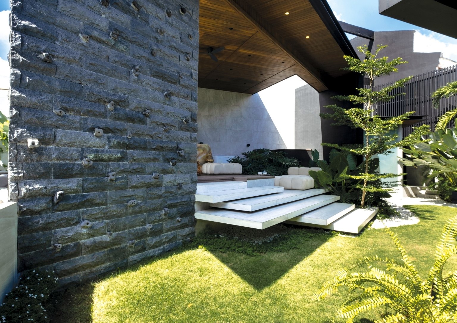 A triangular roof with a steel wide flange fascia wrapped around the roof edges covers the pavilion. With its high ceiling finished with treated tanguile wood, the roof is then supported by a black slate wall. This is also covered with a wall climbing feature. A series of wide steps with varying lengths mimics what a natural stone step would look like. The pavilion’s flooring is raised to mitigate perennial flooding. Practicality aside, the raised flooring also emphasizes the pavilion’s role and importance as the focal point of this oasis-like home. As the gathering point for every social event, two lounge beds overlook the lawn.