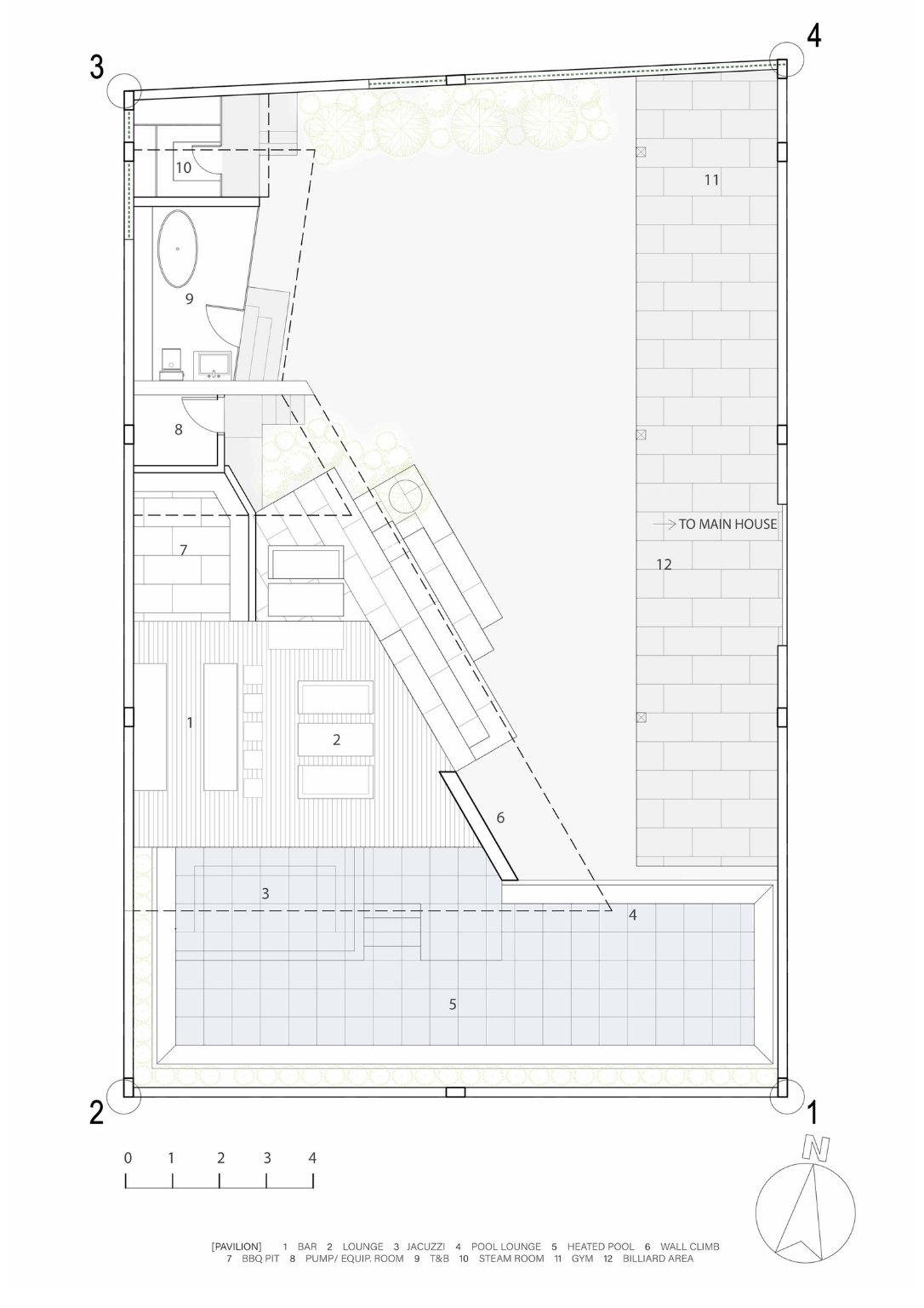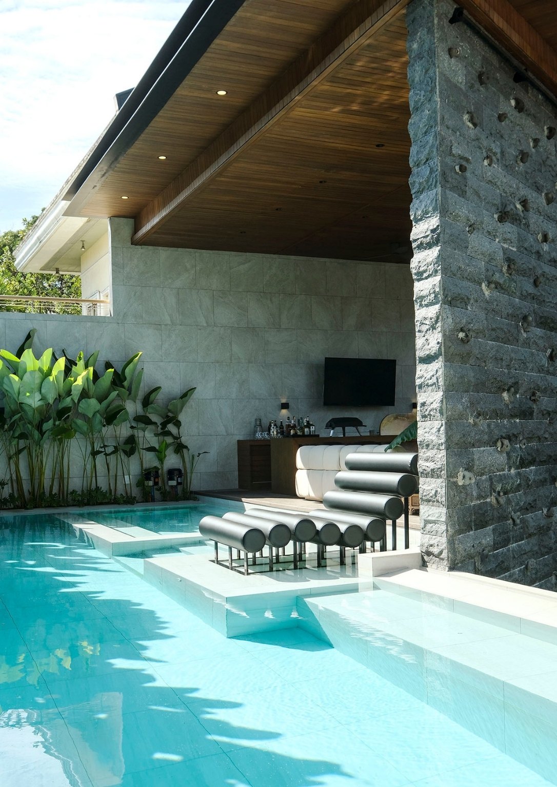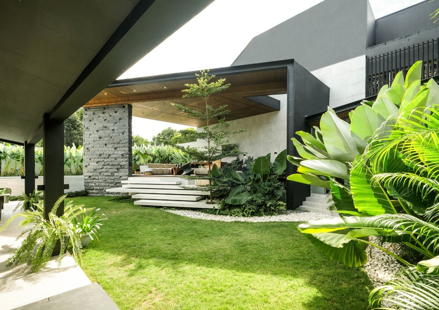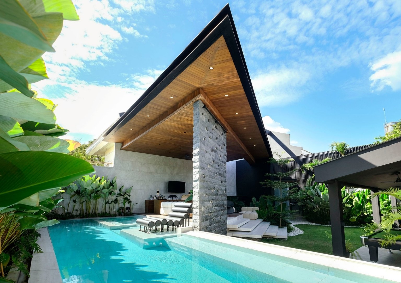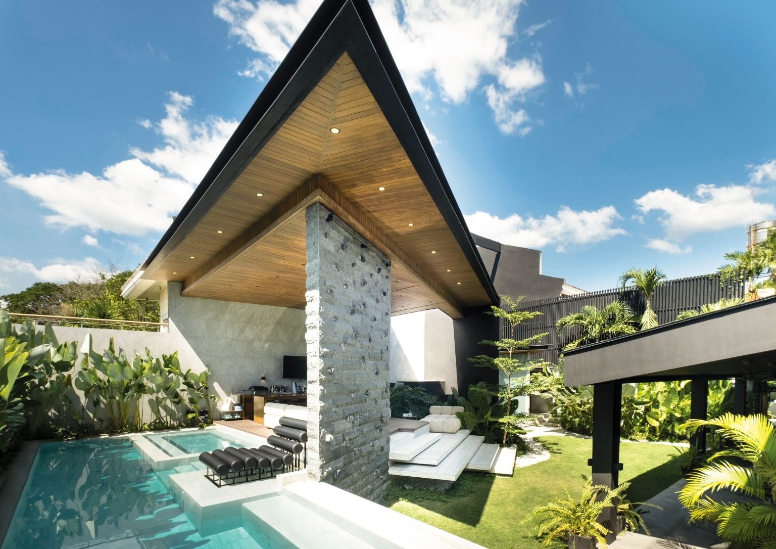 The house is defined by its sharp flat roof with the use of steel wide flange fascia to define its edges, a wide green lawn, a pool and steam room and a small gym with a billiard area. With an elegant use of wood, stone and steel features, the designers have created a modern tropical design interpretation of a recreational space for their client.