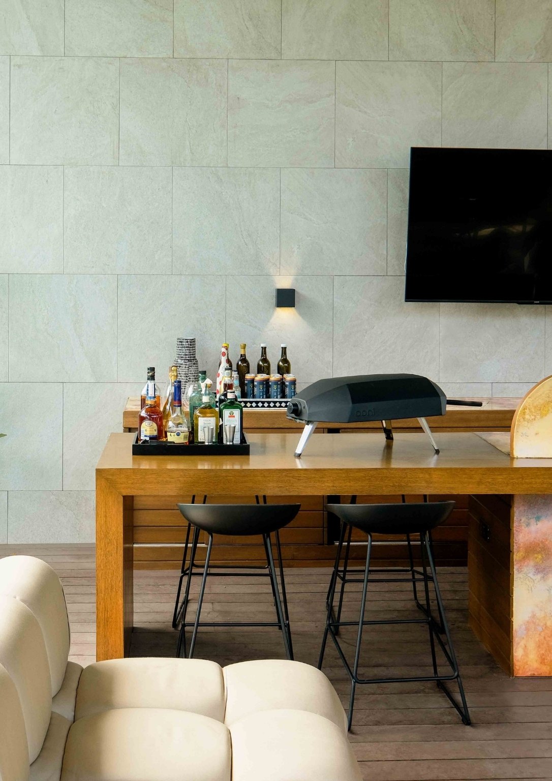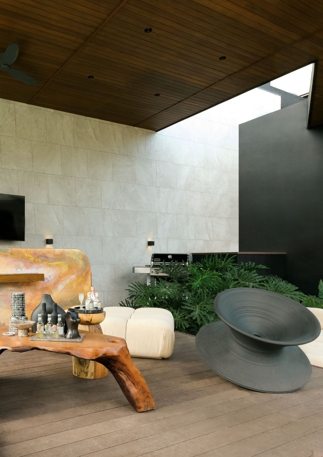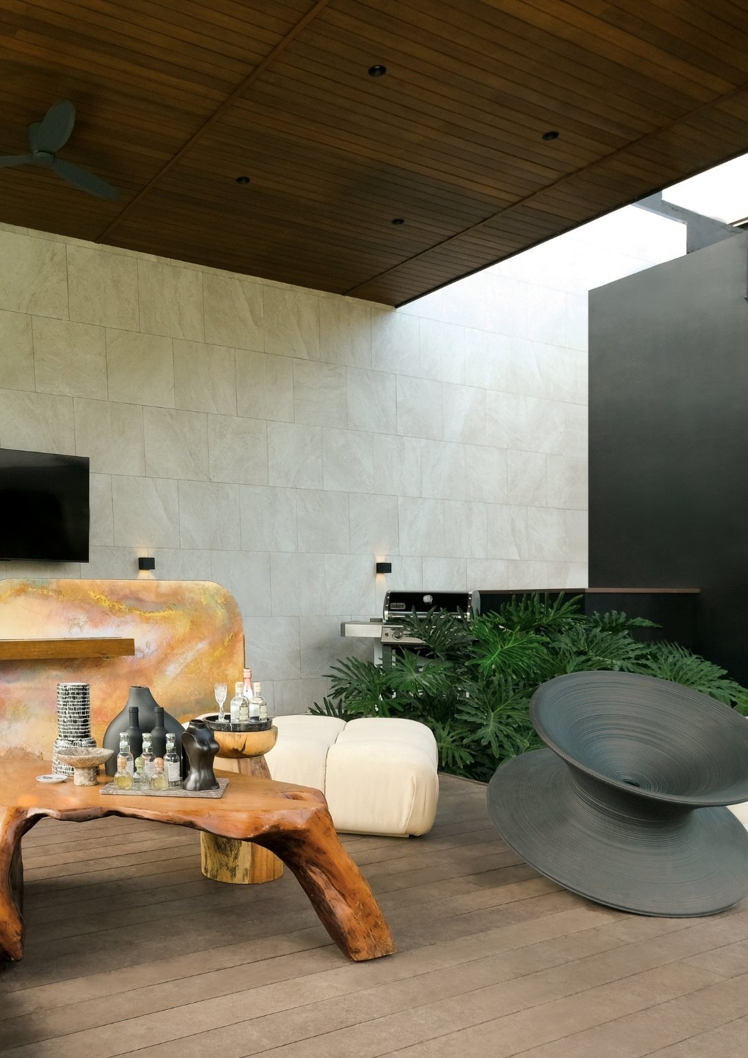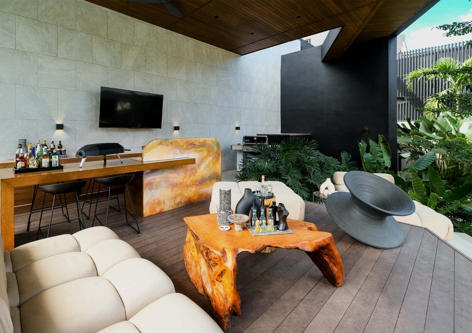 Entering the space, a covered billiard area and a gym will be the first to greet guests. A billiard table on the left and a fully customized METCON gym on the right complete with an AirBike, a custom-made rig, Squat Rack, adjustable free weights, full-cushioned matting, and a wall bar for home workouts. The columns and ceiling of this covered area is painted in black finish, making the space appear smaller and in turn gives an illusion of a bigger space outside of it. The black paint finish of its columns and ceiling also compliments the site and acts as the transition space from darkness to light, a portal leading to the main focal point of the area.