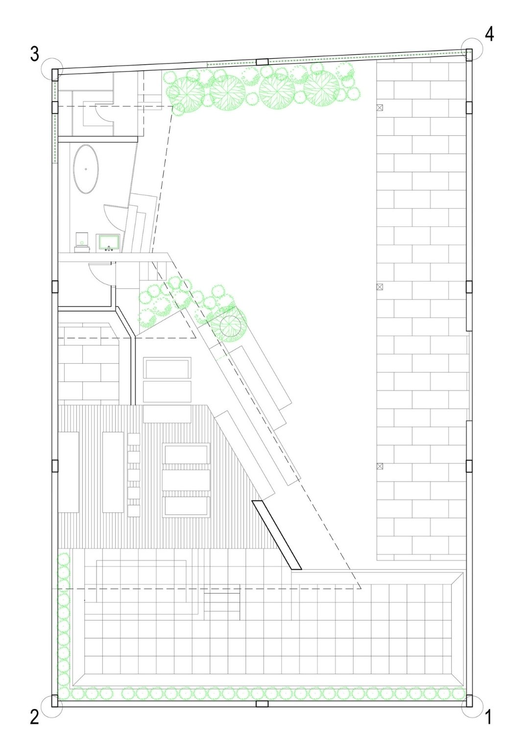 Meanwhile, the perimeter fire wall served as a backwall. Siting the pavilion at a 30° degree angle from the focal wall was such an unexpected move that it was practically a magician’s move. The freedom of having the space to go up to two stories gave Ann and Jason the opportunity to have a soaring ceiling, almost five-meters high.