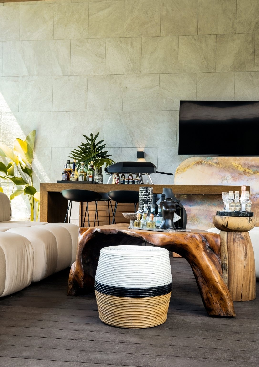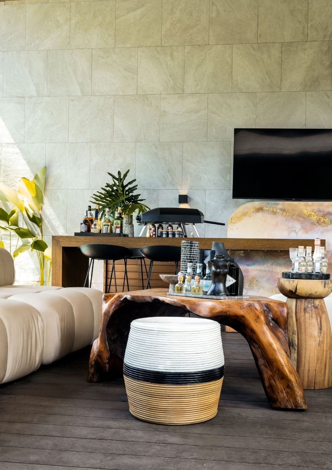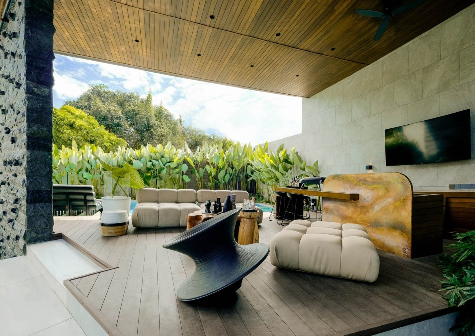 Accompanying lush tropical foliage is a beautiful Talisay tree that lorded over the rest of the landscape. According to Jason, the landscaping wasn’t simply for aesthetic. A drip pipe was actually buried next to the tree’s roots for a steady supply of water. The natural look also extends through a natural color palette of beige travertine, teak, and gray split face rock expertly used to segue to the main house. The various shades of green from the lush landscaping also compliments the colors and materiality.