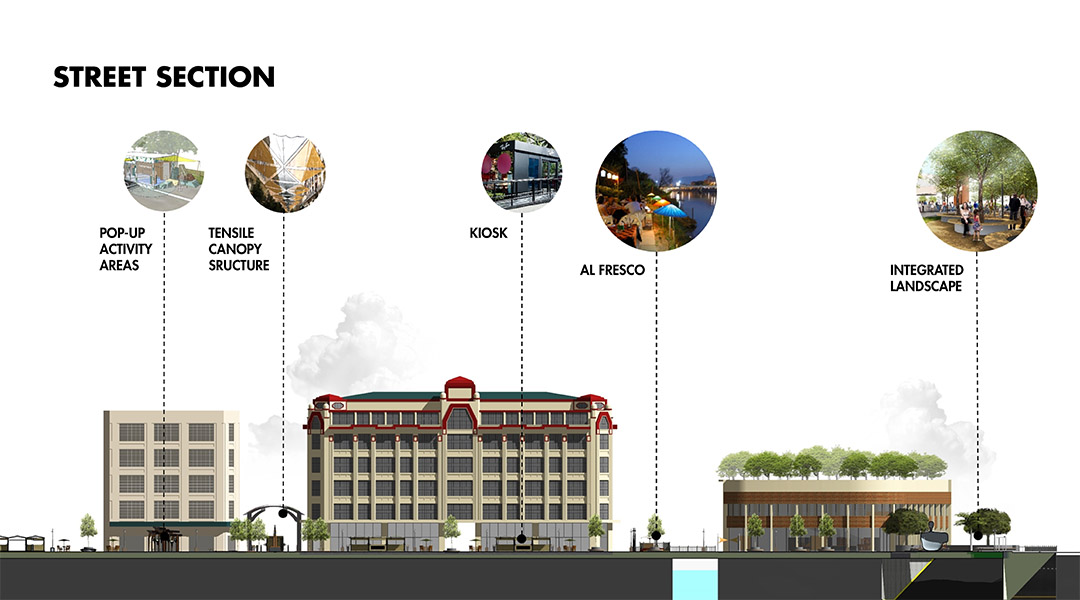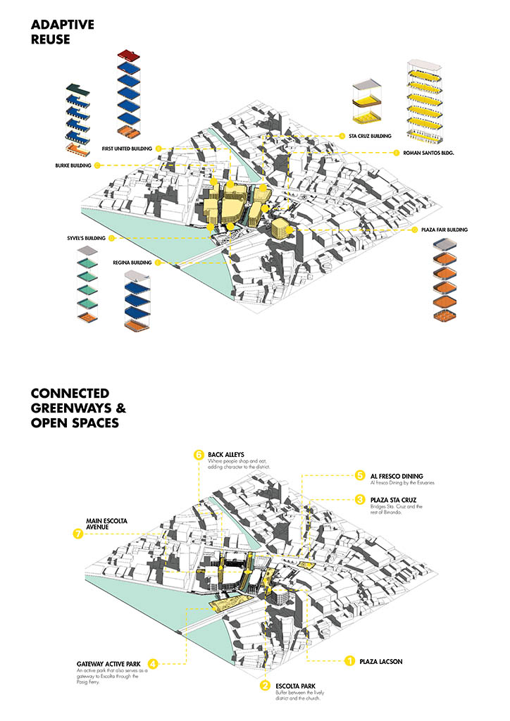 A building program was identified complementing general neighborhood activities. Roman Santos Building is identified as a residential/commercial building, Syvels Building is identified as a cultural/commercial building, Sta. Cruz Building is identified as a Cultural and Tourist Center, and Plaza Fair is identified as a commercial building with focus on programming for local street food/hawker type of building.