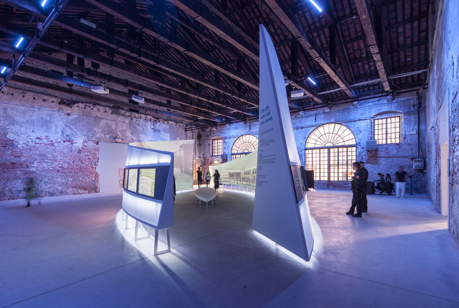 We enter the arched doorway of the Arsenale and see a concept we heard of months ago materialized. It is surreal, like walking through a city you’ve only encountered through descriptions. In this city, there are no pearly gates or gold walls. Instead, drenched in indigo light, there is a tension of human life thriving on streets wide and narrow, in commercial establishments packaged as the “greater good,” and in the shadows of intermittent spaces.