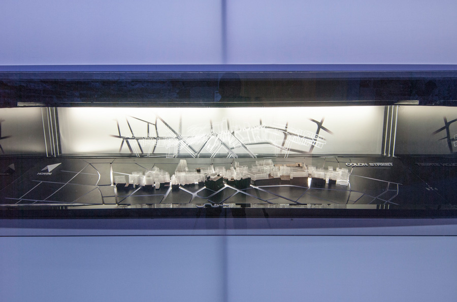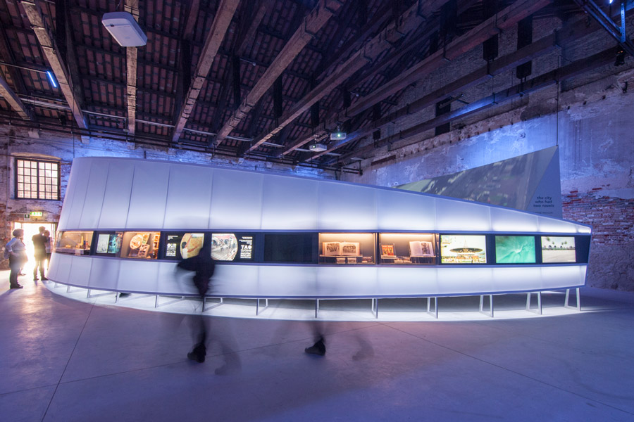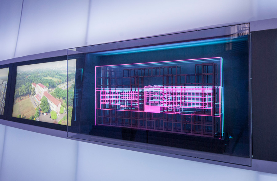 The Pavilion’s main feature is the impressive 14-meter-long wedge screen that slithers its way and cuts across the vast space, with its highest point at 4 meters tapering down to 1.8 meters.