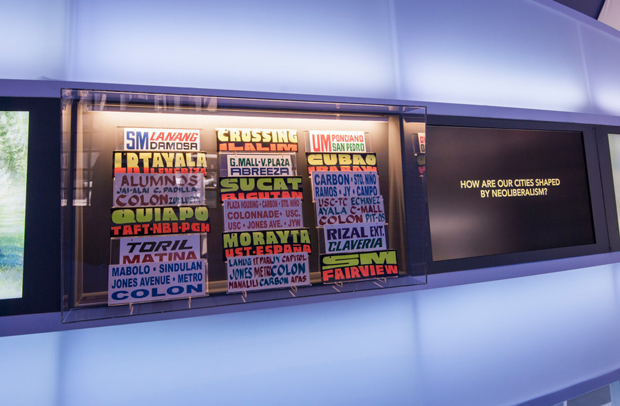 Output from the different collaborators are displayed on the outside walls of the screen. One side entitled (Post)Colonial Imaginations contains the projects of De la Salle – College of Saint Benilde; TAO-Pilipinas; and University of the Philippines – Mindanao. The other side called Neoliberal Urbanism showcases the works of University of San Carlos; University of the Philippines – Diliman; and photographers Marvin Maning and Jinggo Montenejo.